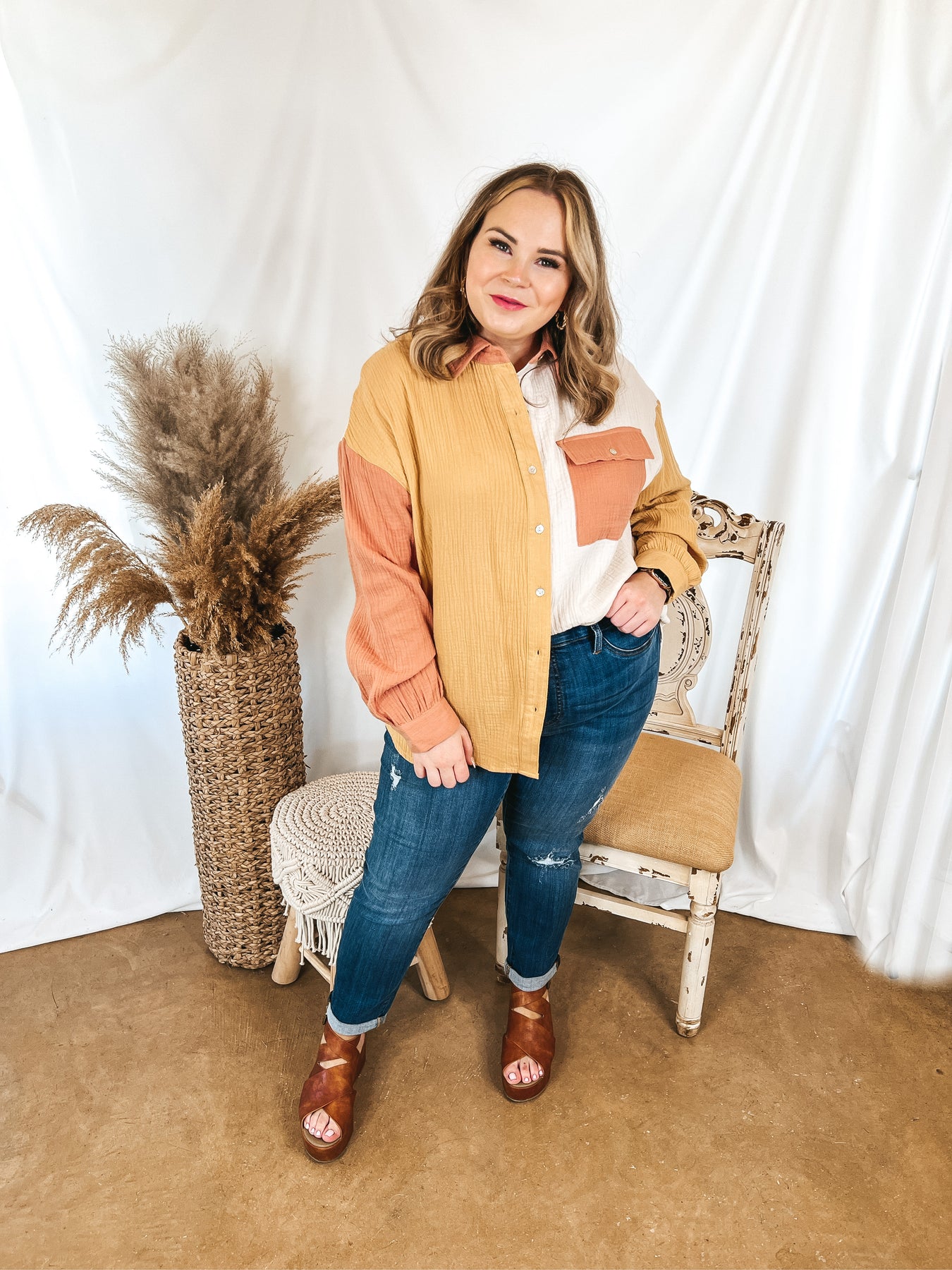 Last Chance Size Medium, Large, XL & 1XL | Highly Requested Button Up Color Block Top in Mustard and Clay Orange