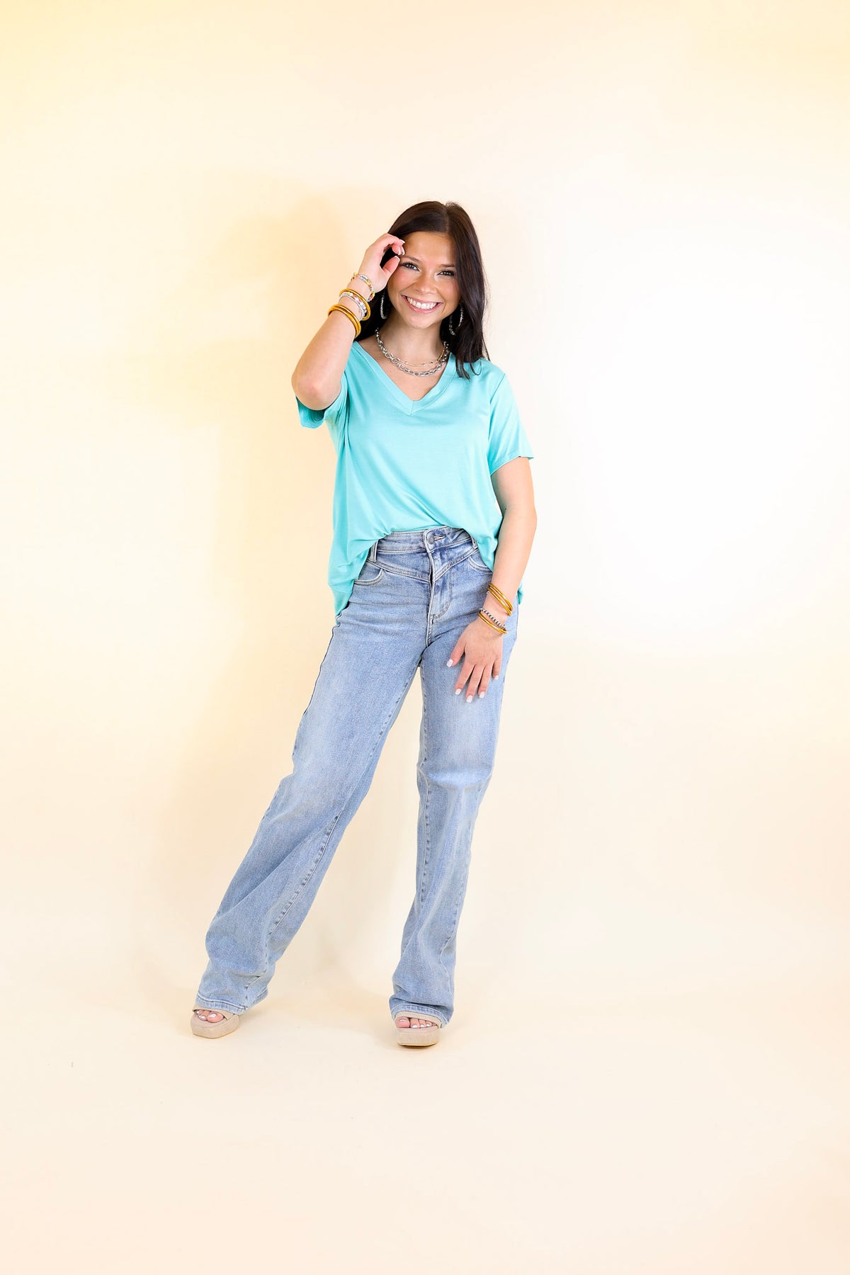 It's That Simple Solid V Neck Tee in Aqua Blue