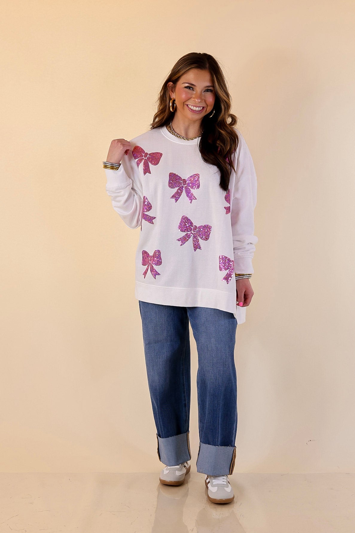 Mud Pie | Feeling Extra Oversized Pink Sequin Bows Graphic Sweatshirt in White