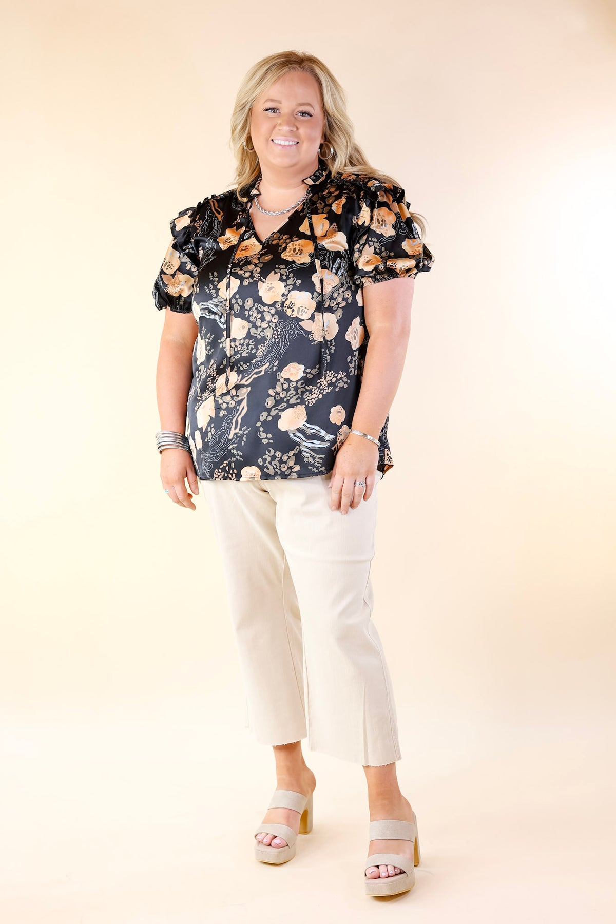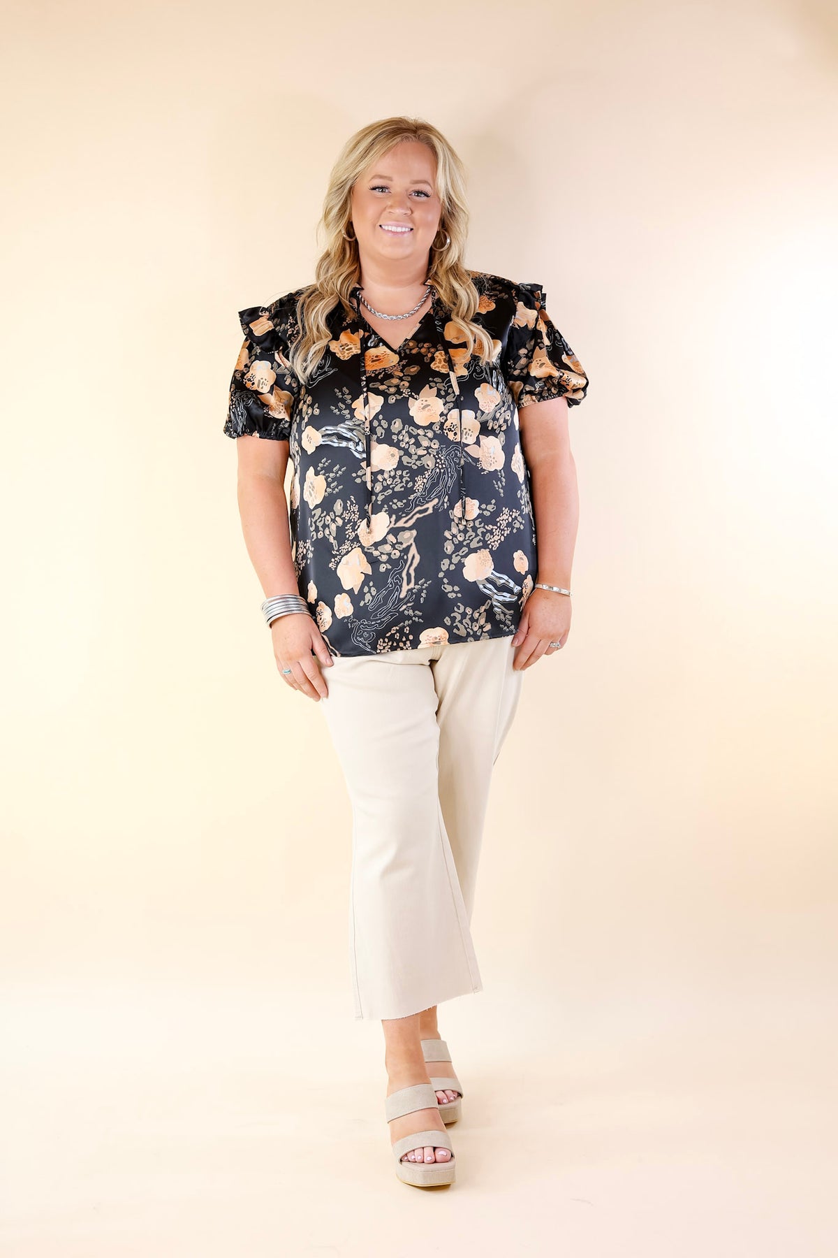Discover a top as unique as you are! Our one-of-a-kind piece features smocked shoulders, charming ruffle detailing, a captivating keyhole and tie front, short sleeves for a touch of flair, and an adorable floral and animal print. Elevate your style with this versatile top that's sure to turn heads wherever you go!