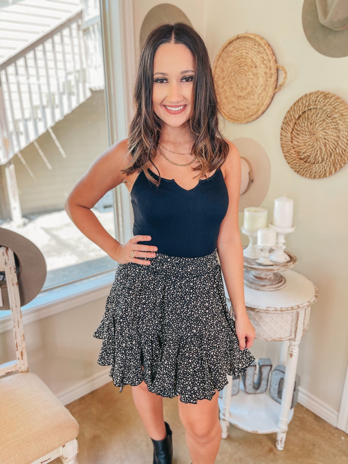 Pure Delight Ribbed Spaghetti Strap Body Suit with Notched Front in Black