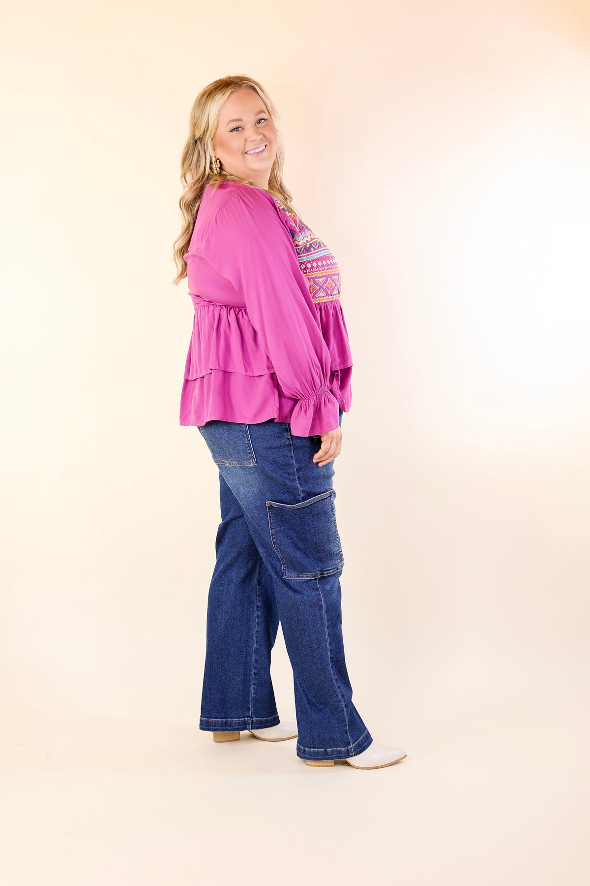 Rhythm Of The Season Embroidered Long Sleeve Top in Magenta