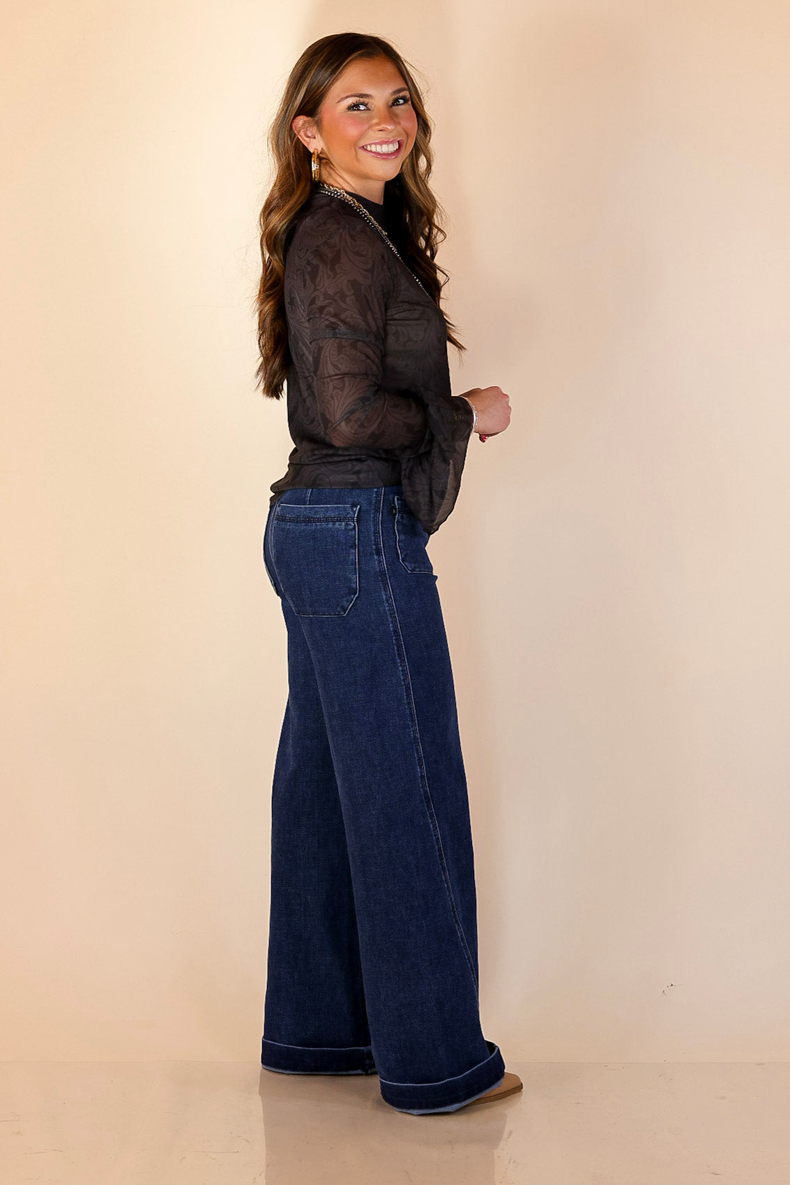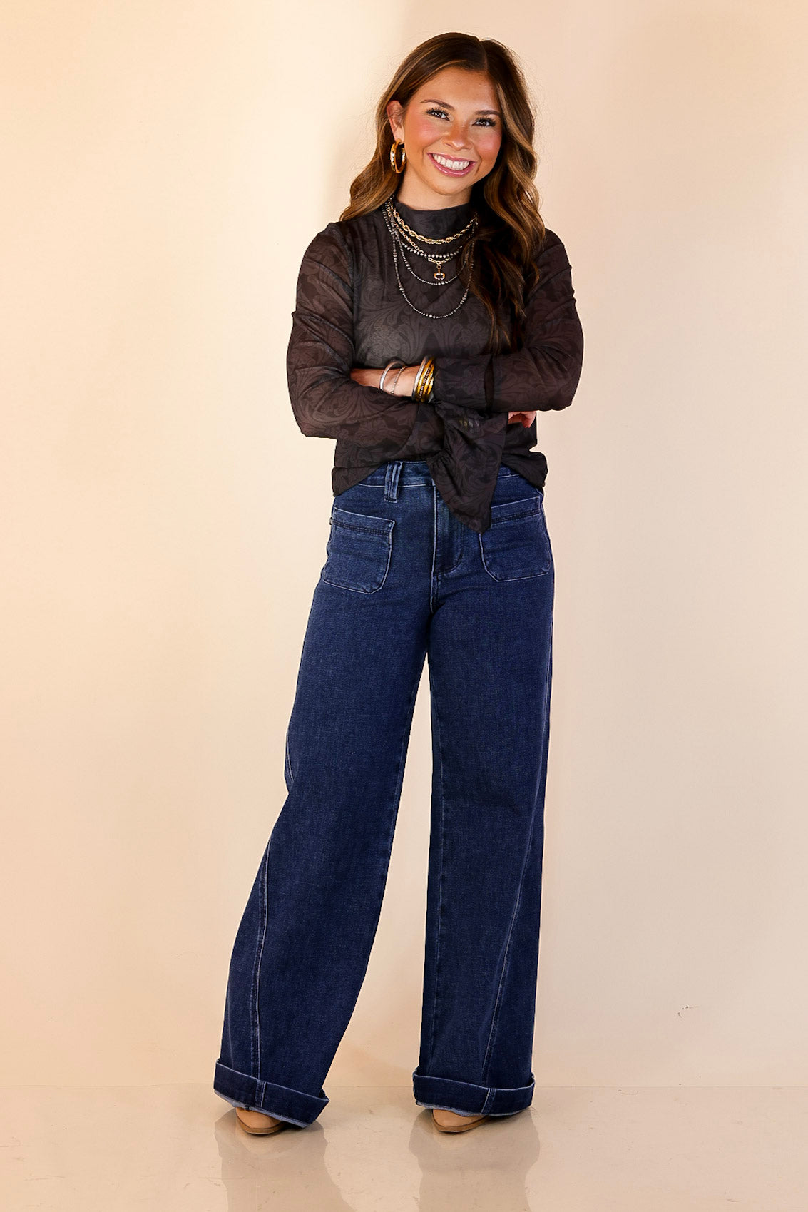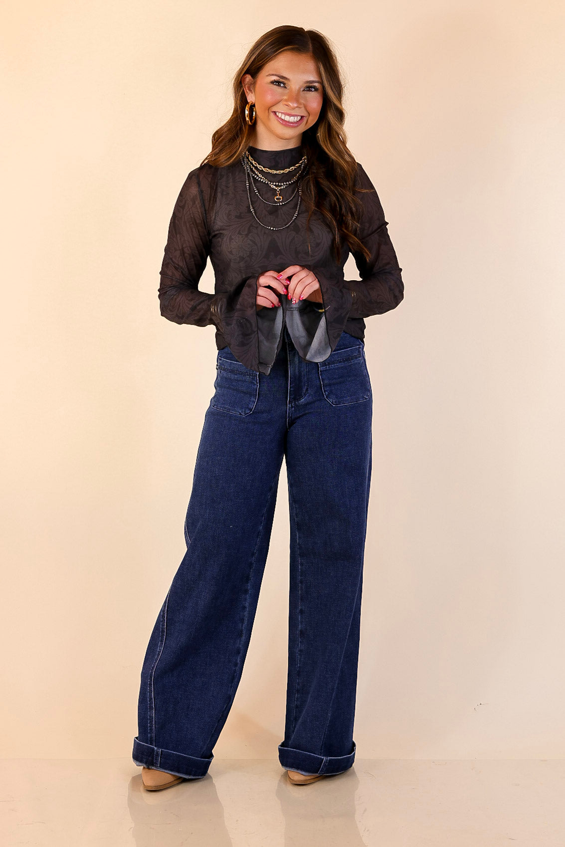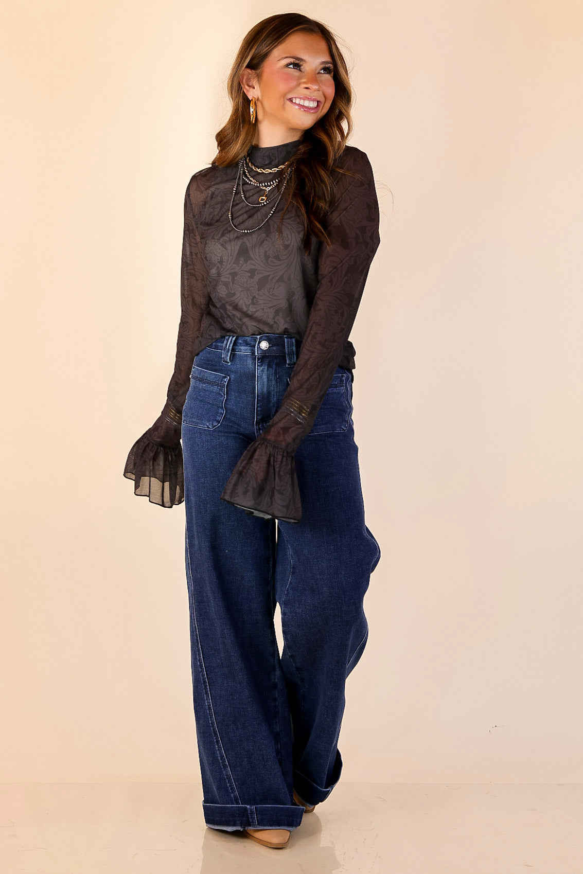 The Sheer & Sophisticated Long Sleeve Mesh Top is an elevated take on your favorite sheer layering piece. Designed in a lightweight sheer mesh fabric, this top features a fitted silhouette with delicate ruffle sleeves that add soft movement and a polished finish. The subtle sheer texture makes it perfect for layering under jackets, vests, and sweaters, while the ruffle detail allows it to stand out beautifully on its own with a cami. This is the kind of piece that instantly elevates denim and makes everyday outfits feel intentional, confident, and refined.