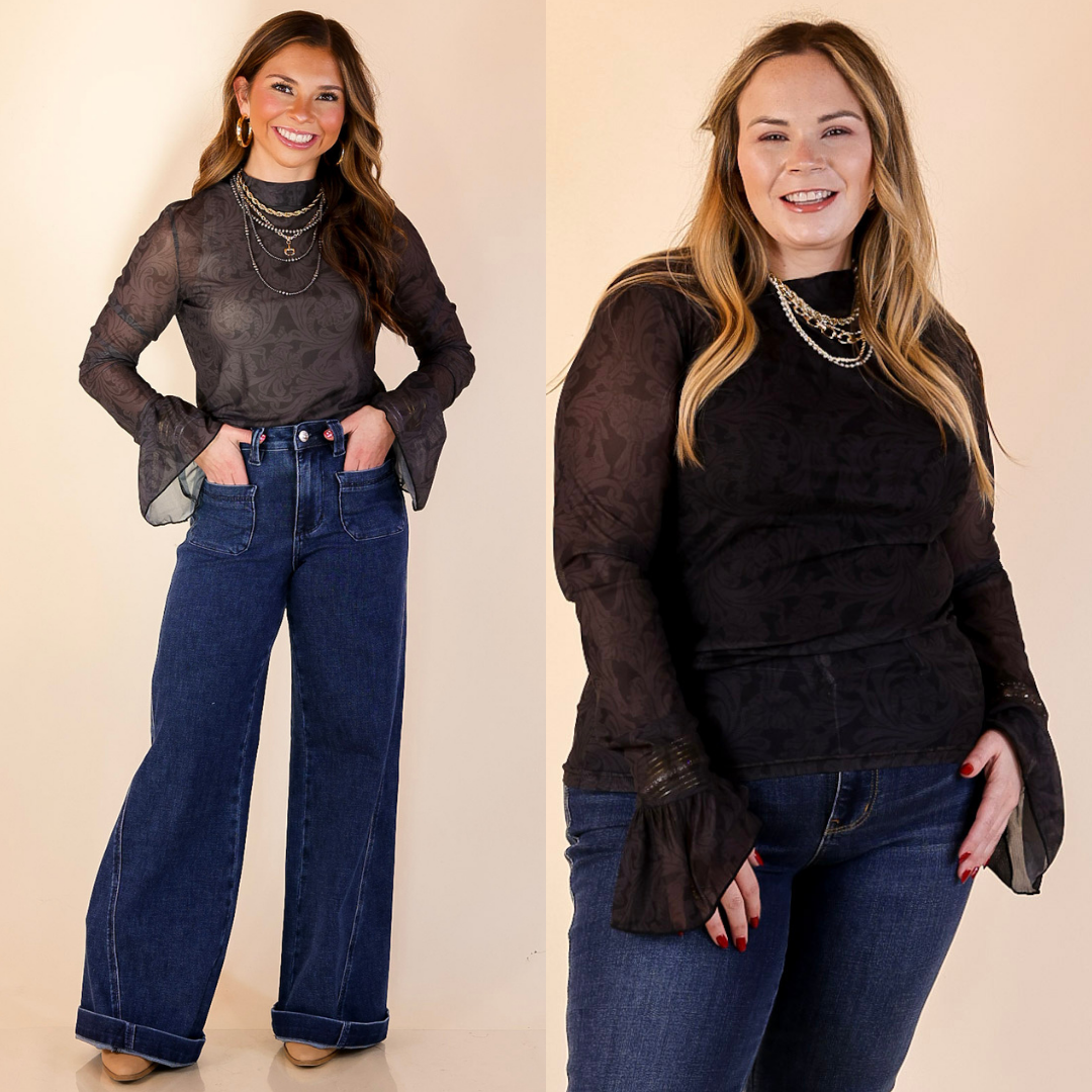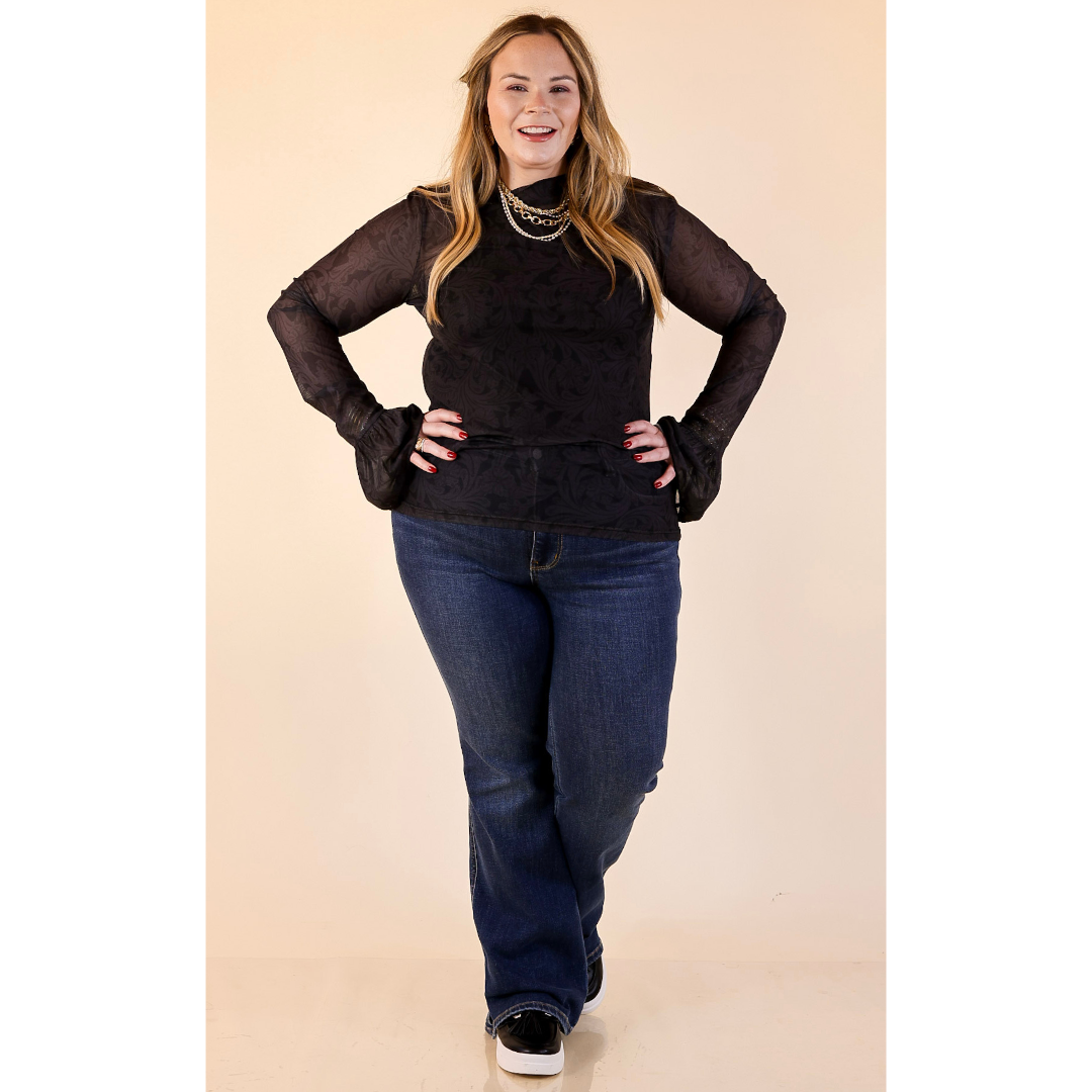 Sheer and Sophisticated Tooled Print Long Sleeve Mesh Top with Ruffle Sleeves in Black