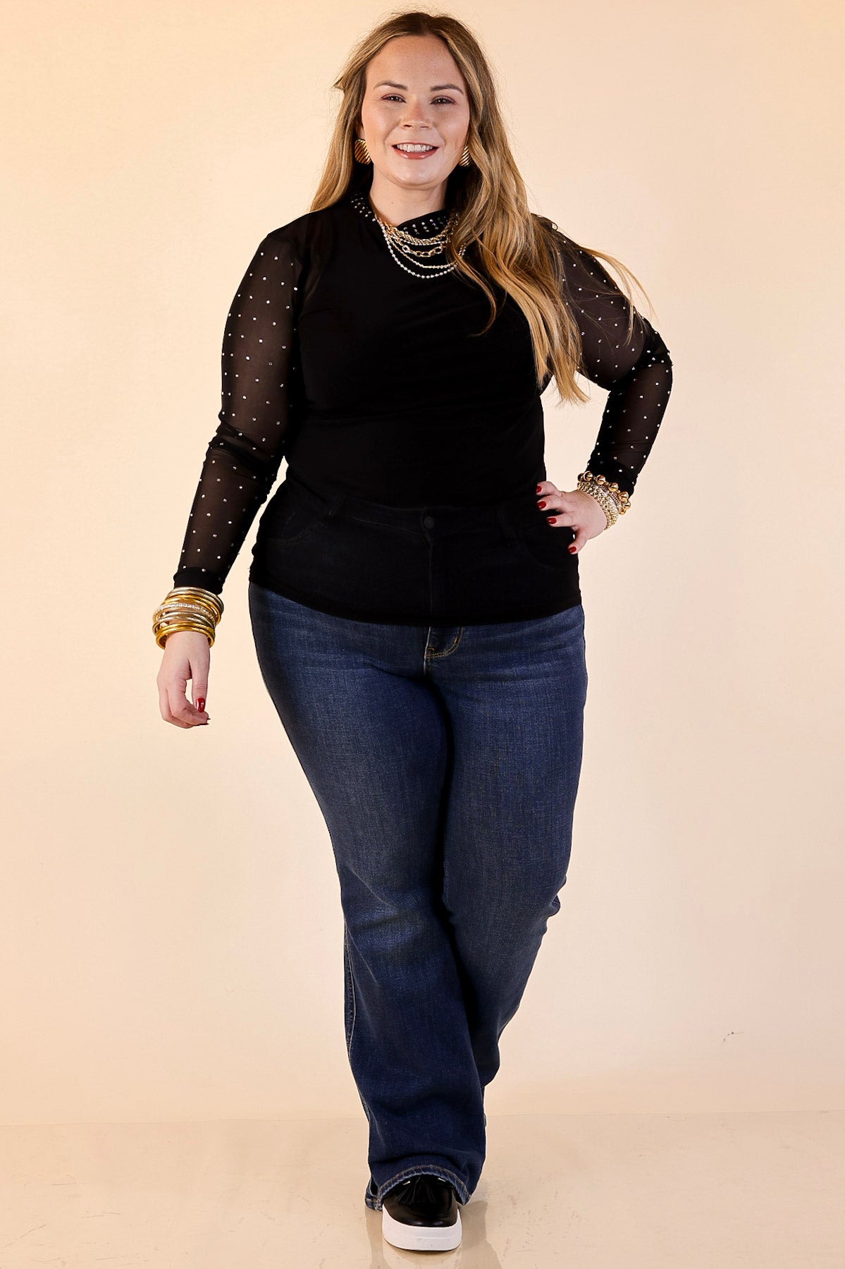 Sheer Confidence Solid Mesh Long Sleeve Top with Rhinestone Detailing in Black