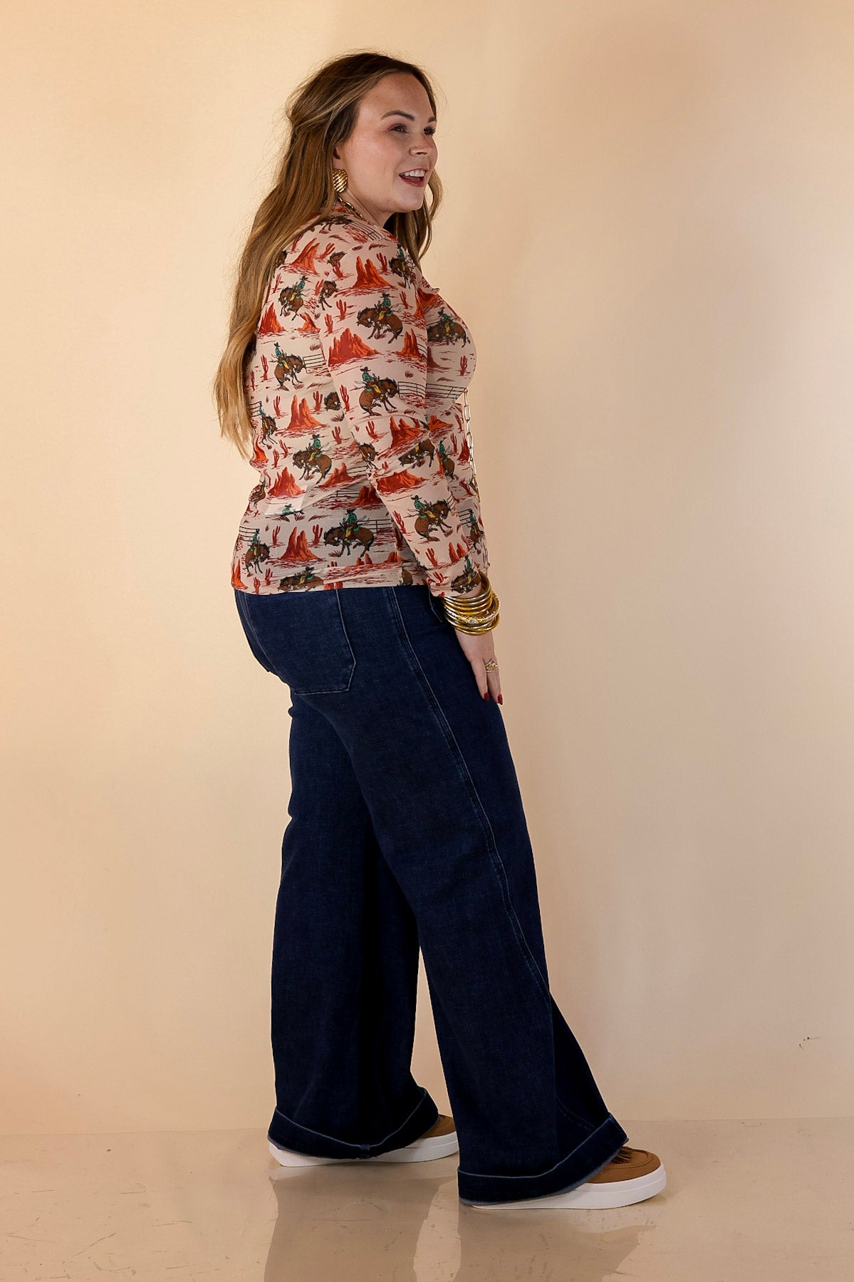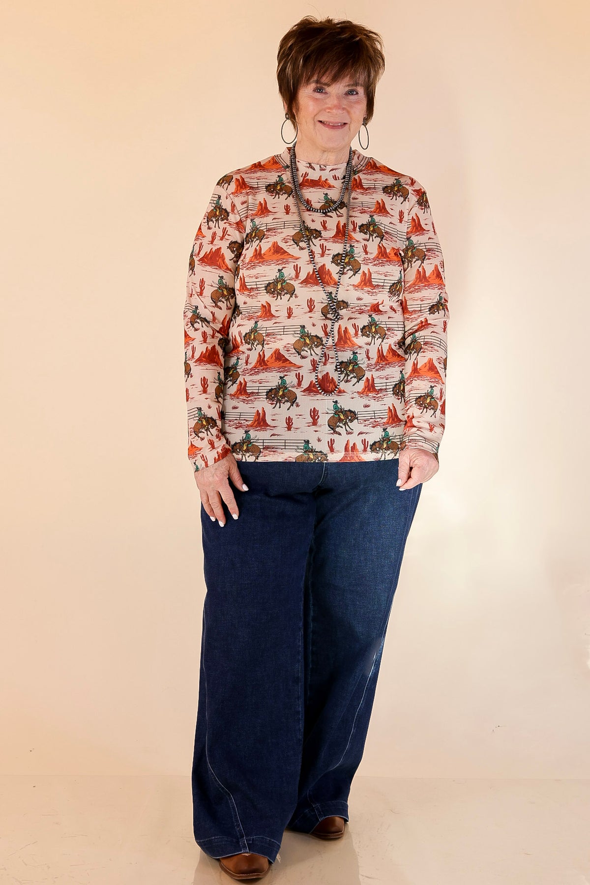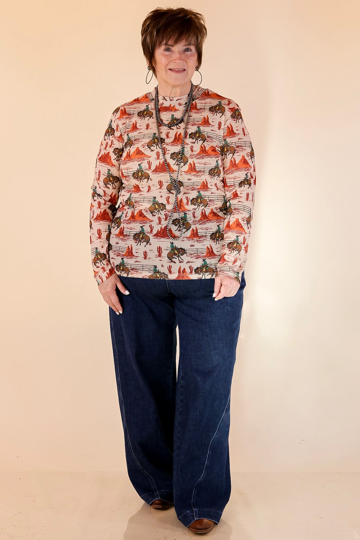 Sheer Confidence Western Red Rocks and Bronc Rider Mesh Long Sleeve Top in Cream