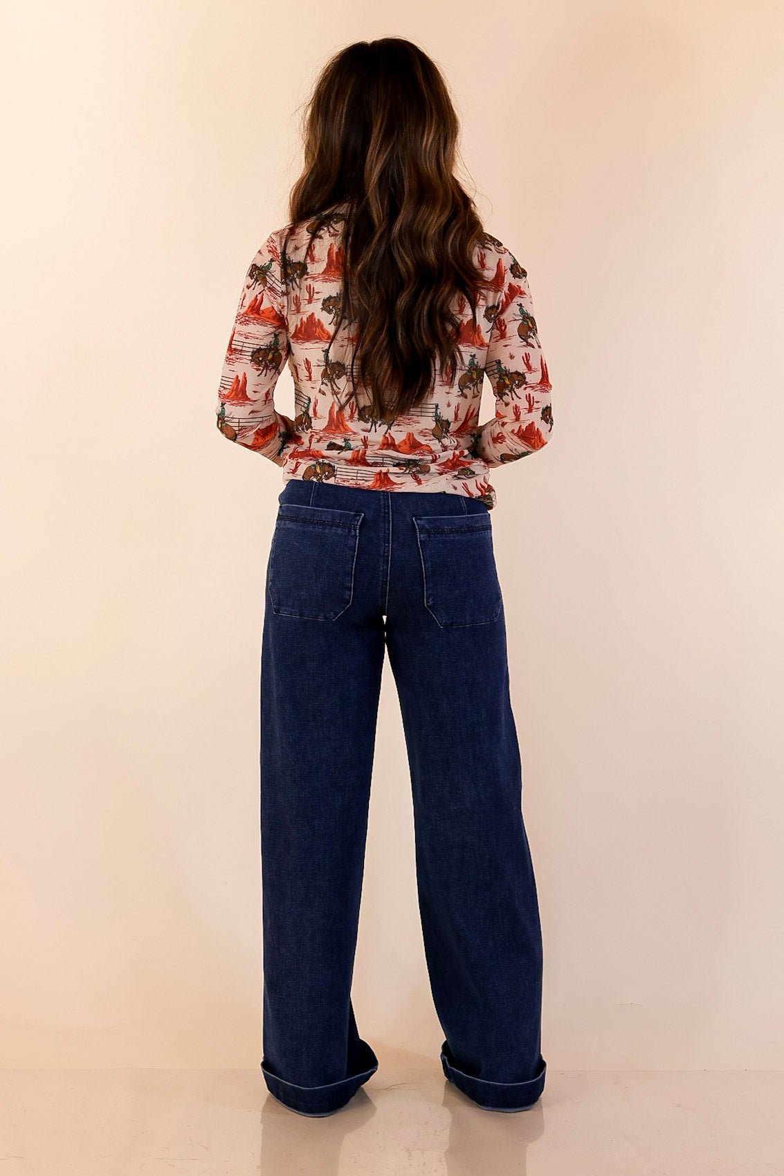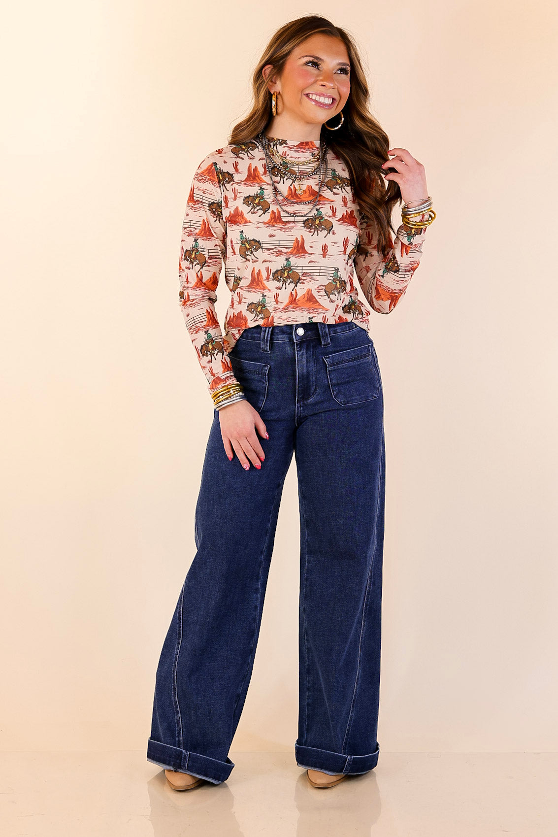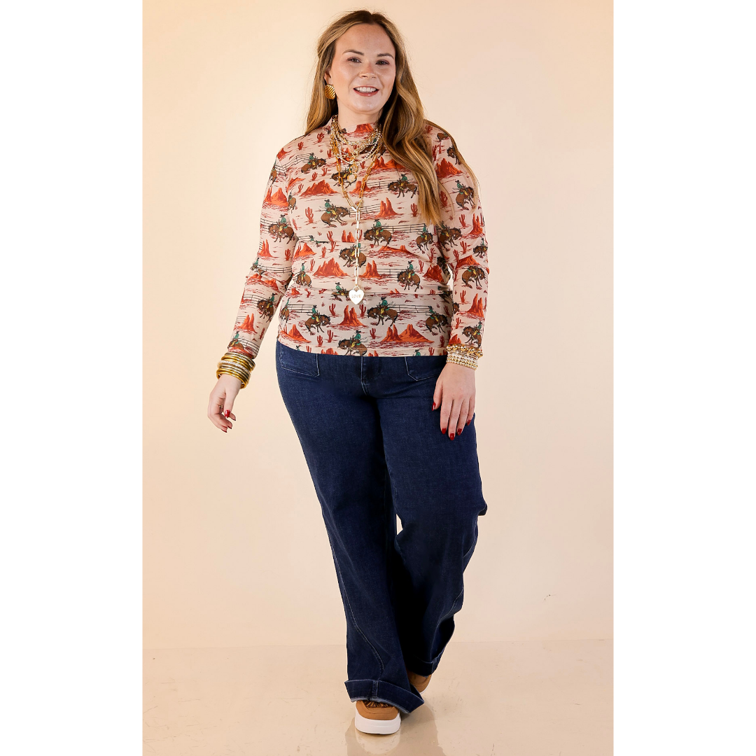 Sheer Confidence Western Red Rocks and Bronc Rider Mesh Long Sleeve Top in Cream