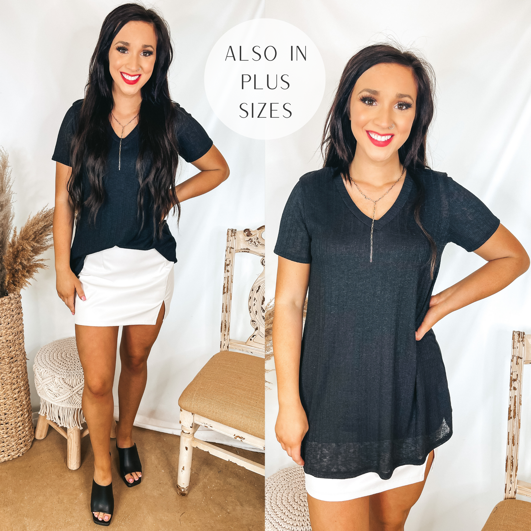 You don't have to look any further for the perfect basic top. It has been looking for you, and here it is! This top includes a ribbed material, v neckline, short sleeves, and so much style. Pair it with your favorite trousers or a pair of cut offs! Halle is wearing a size small.