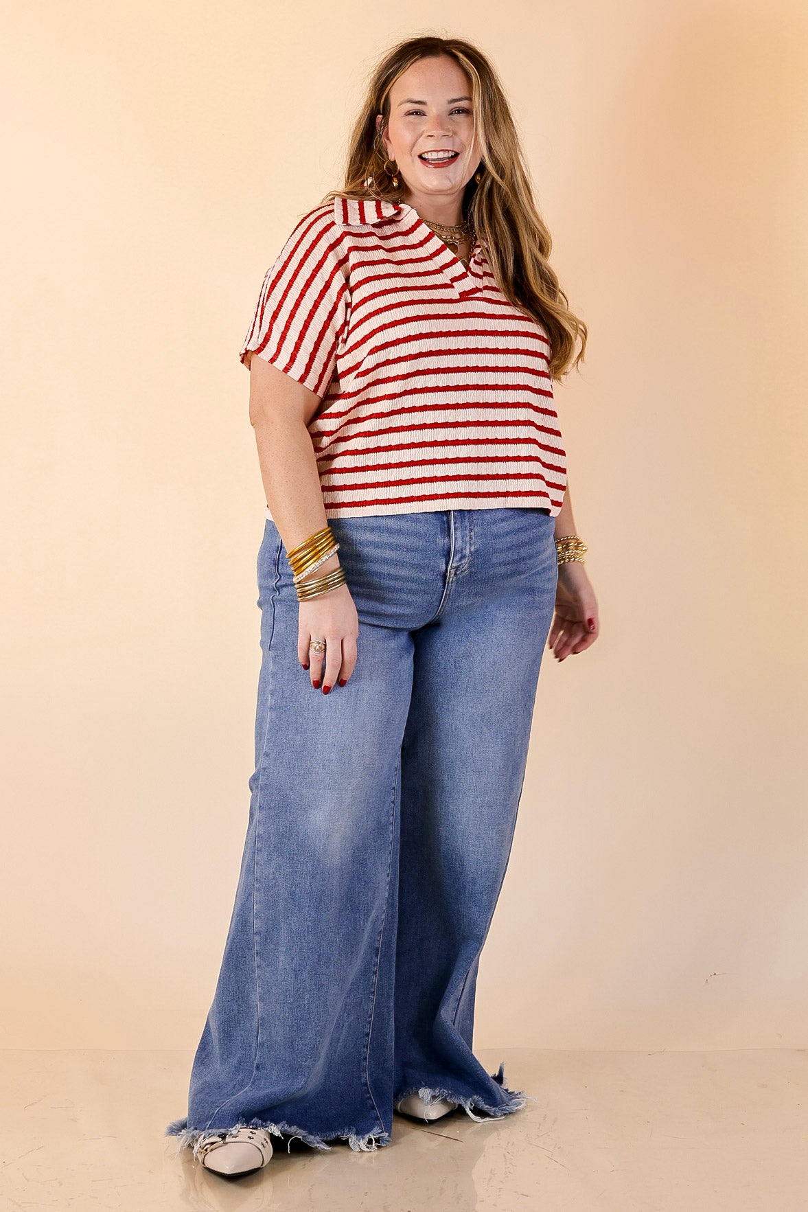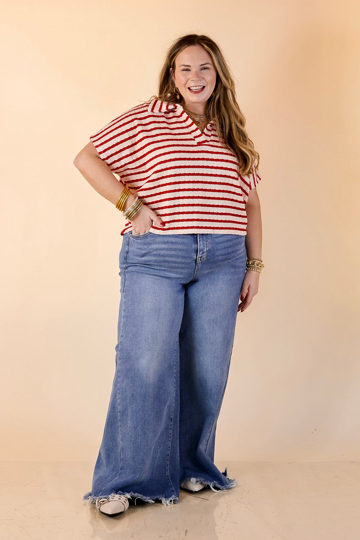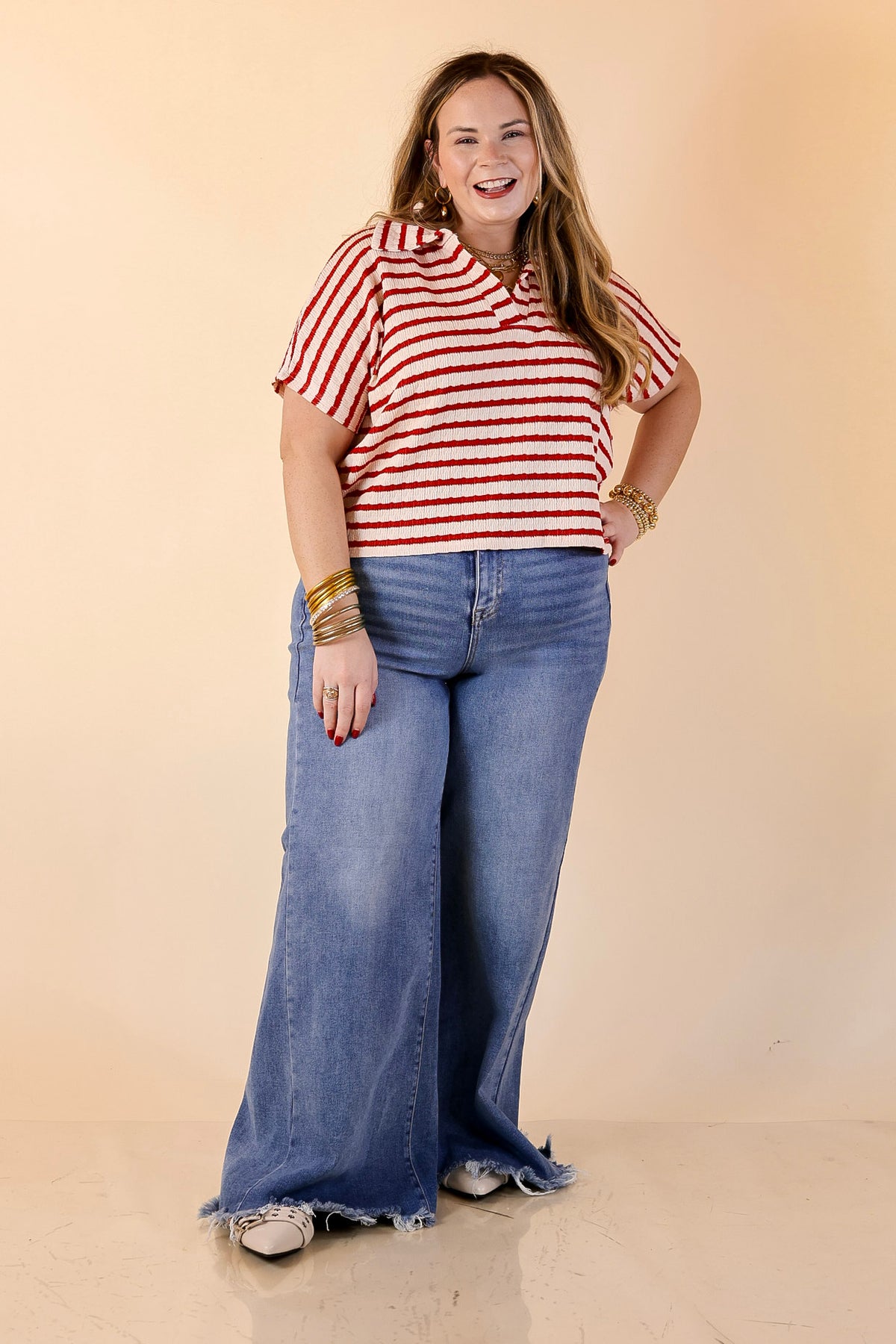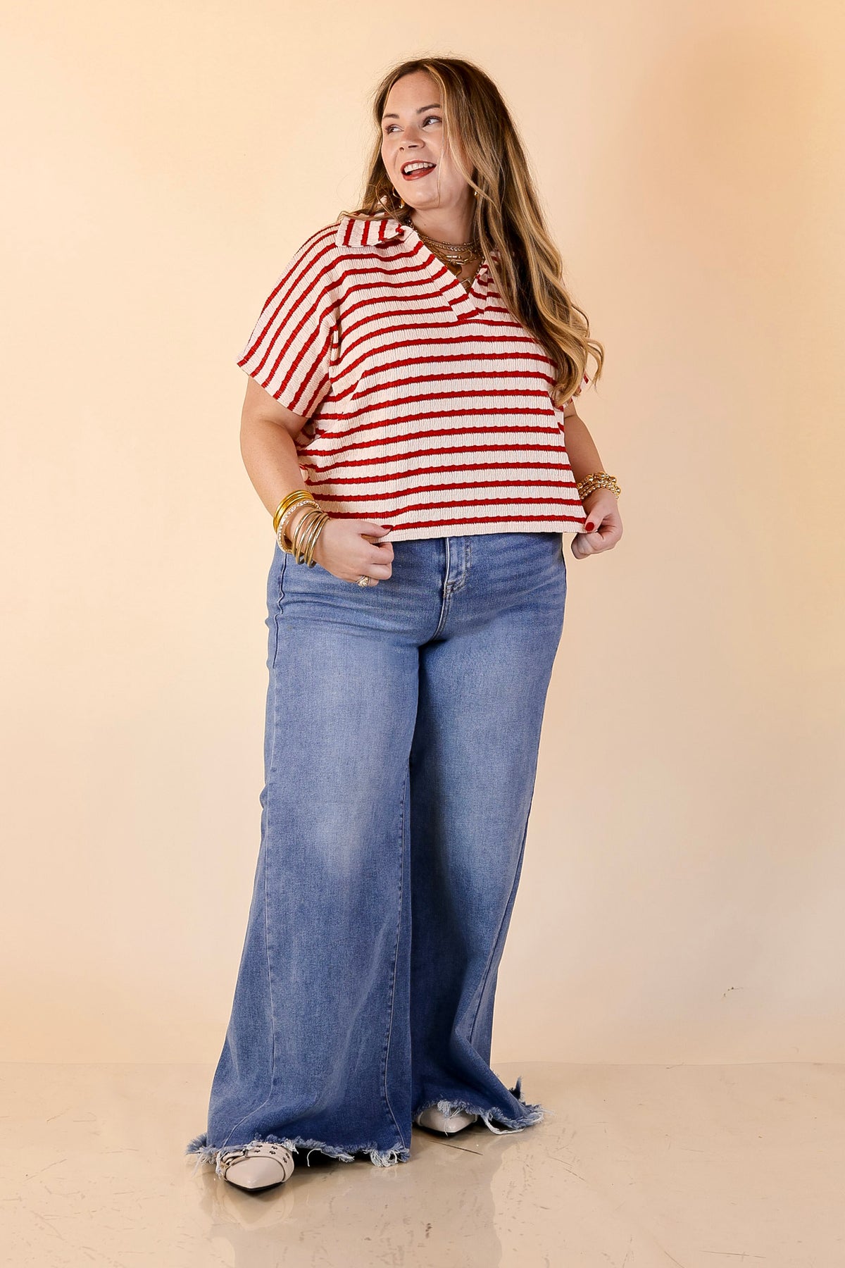 Simply Said Striped Drop Shoulder Collared Cropped Top in Ivory with Red Stripes