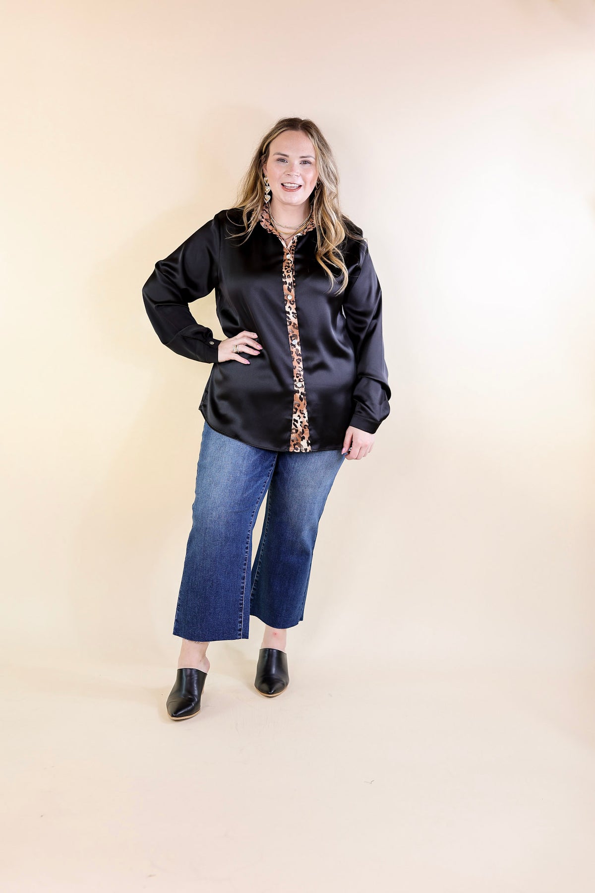 Sugar On Top Long Sleeve Button Up Satin Top with Leopard Print Trim in Black