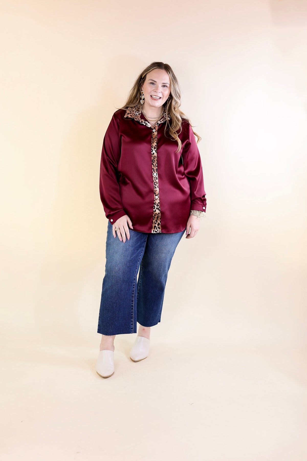Sugar On Top Long Sleeve Button Up Satin Top with Leopard Print Trim in Maroon