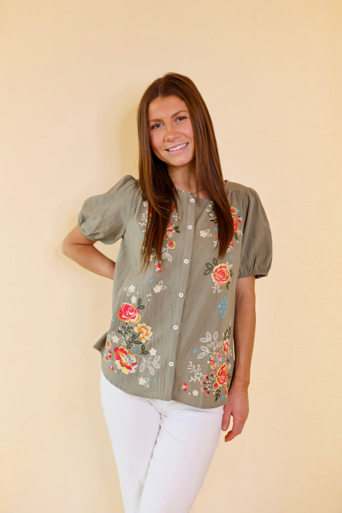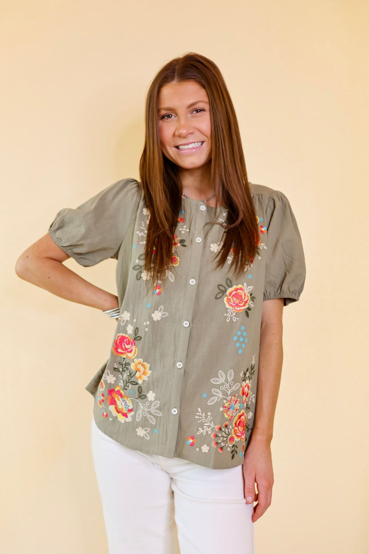 Sunny Forecast Button Up Floral Embroidered Top in Dusty Olive Green - Giddy Up Glamour Boutique