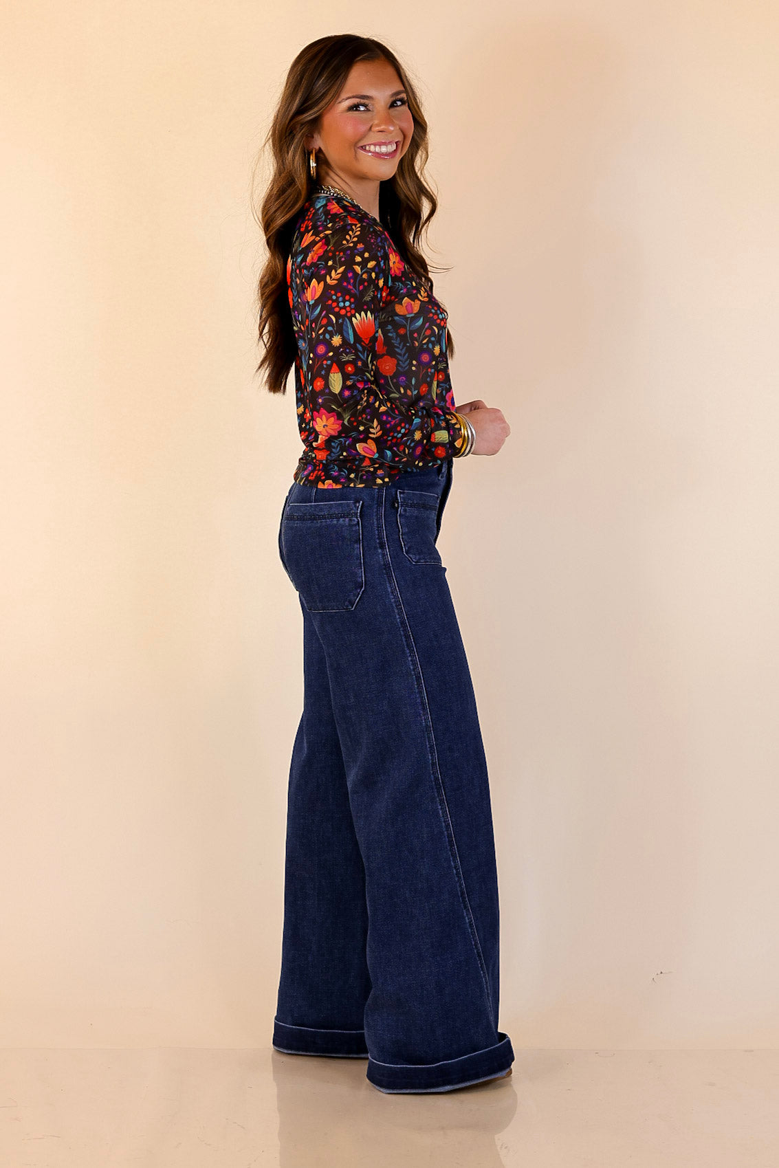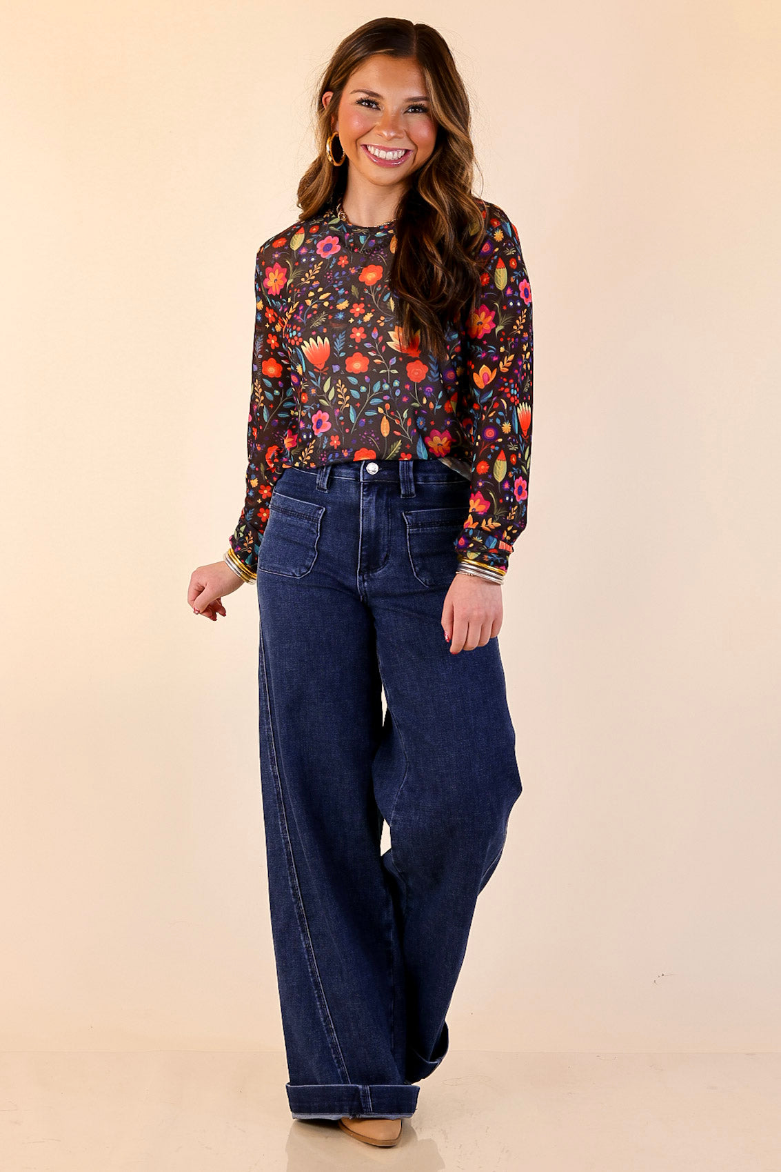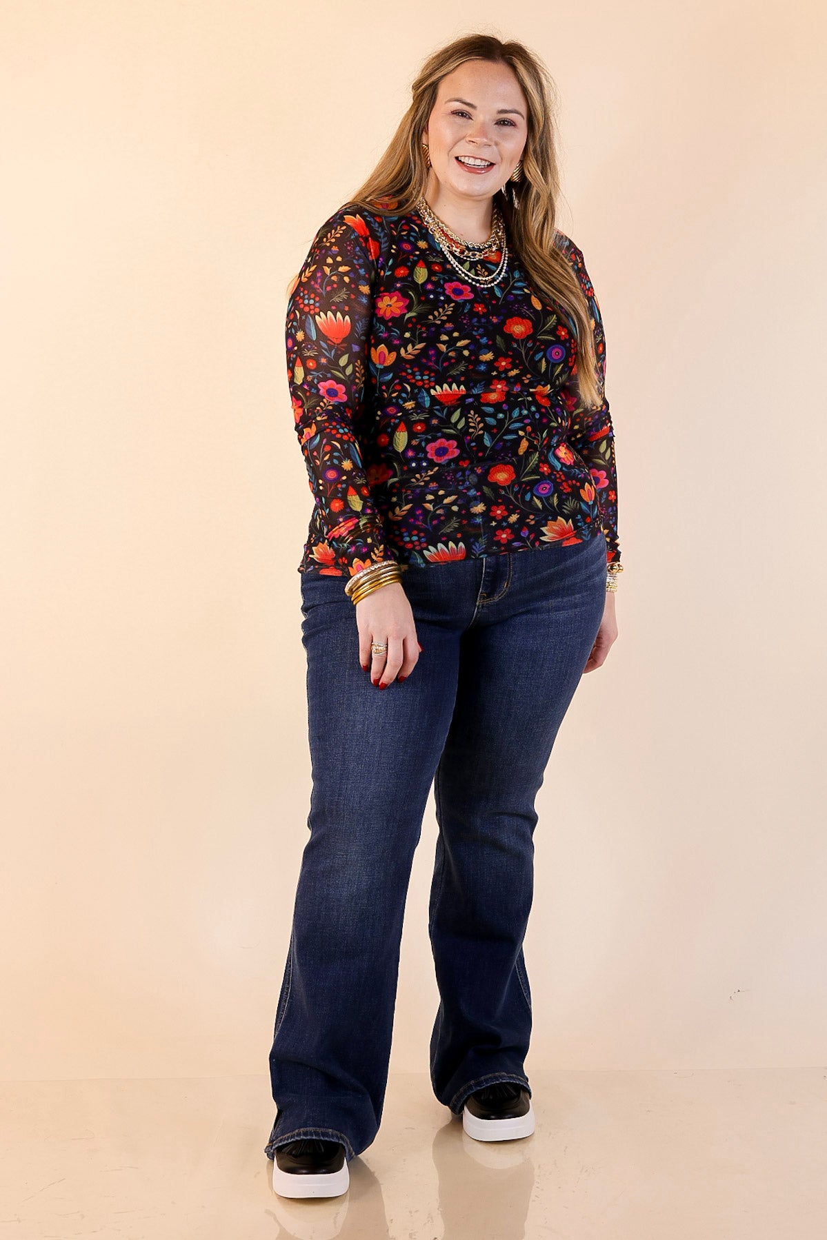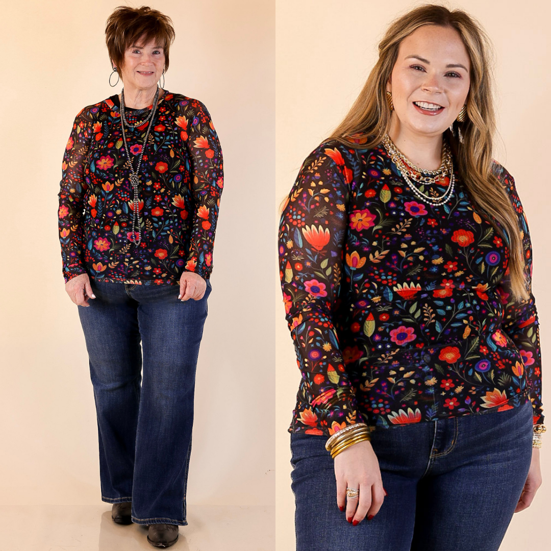 The Perfect Layer Colorful Floral Fiesta Print Mesh Long Sleeve Top in Black