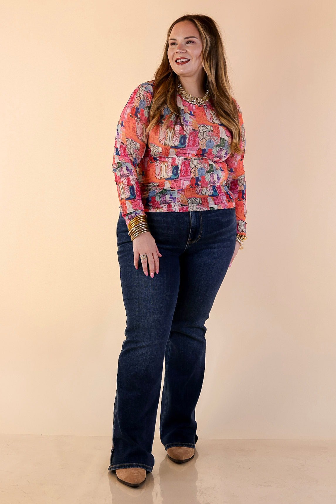 Women’s cream western boot print mesh long sleeve top with pink and coral cowboy boot pattern styled with dark denim and layered gold jewelry.