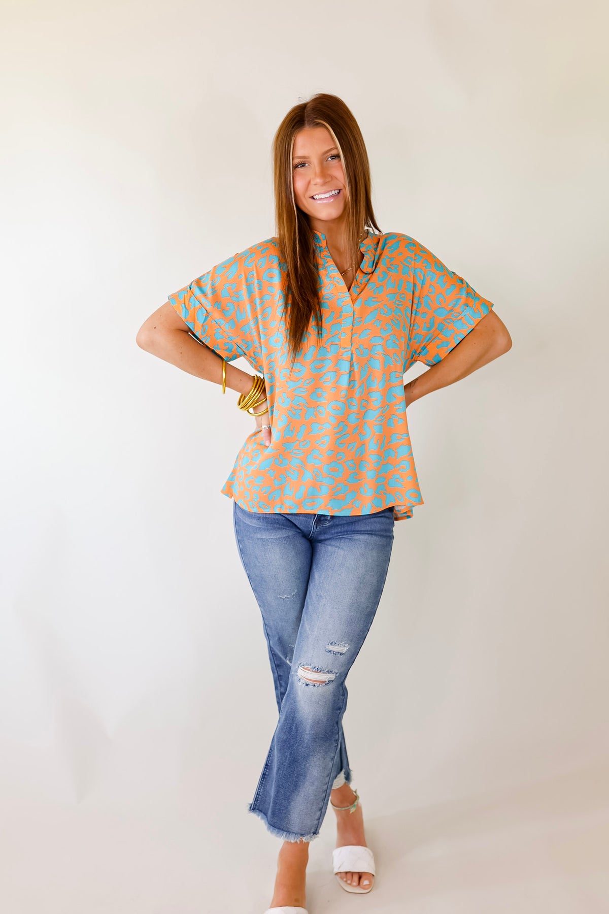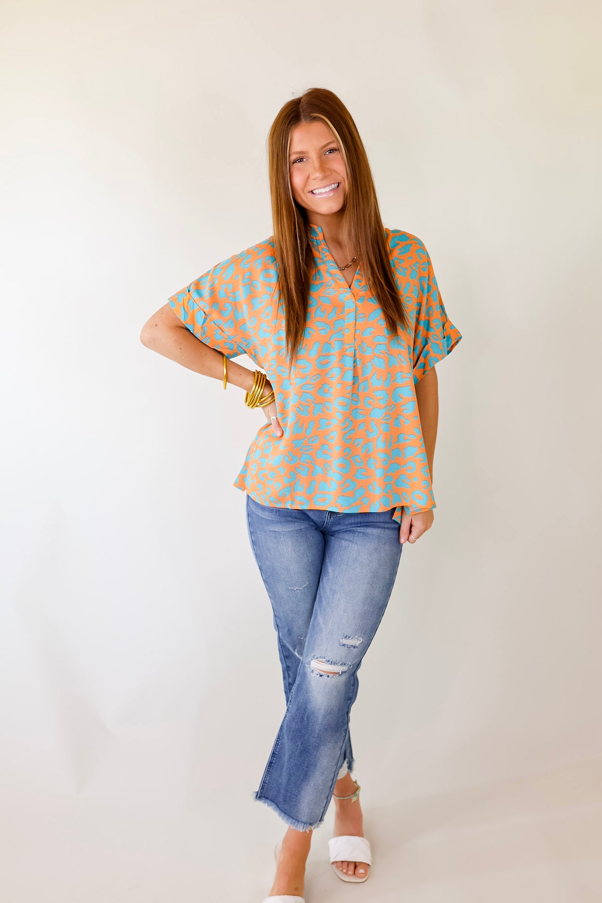 Bold and Beautiful V Neck Teal Leopard Print Top in Orange