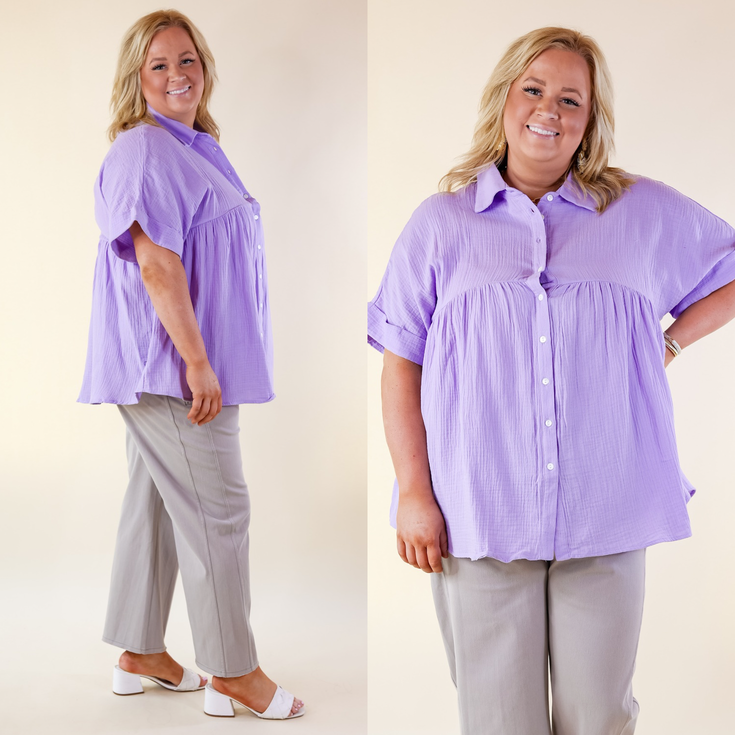 Mellow Mood Collared Button Up Babydoll Top in Lavender Purple