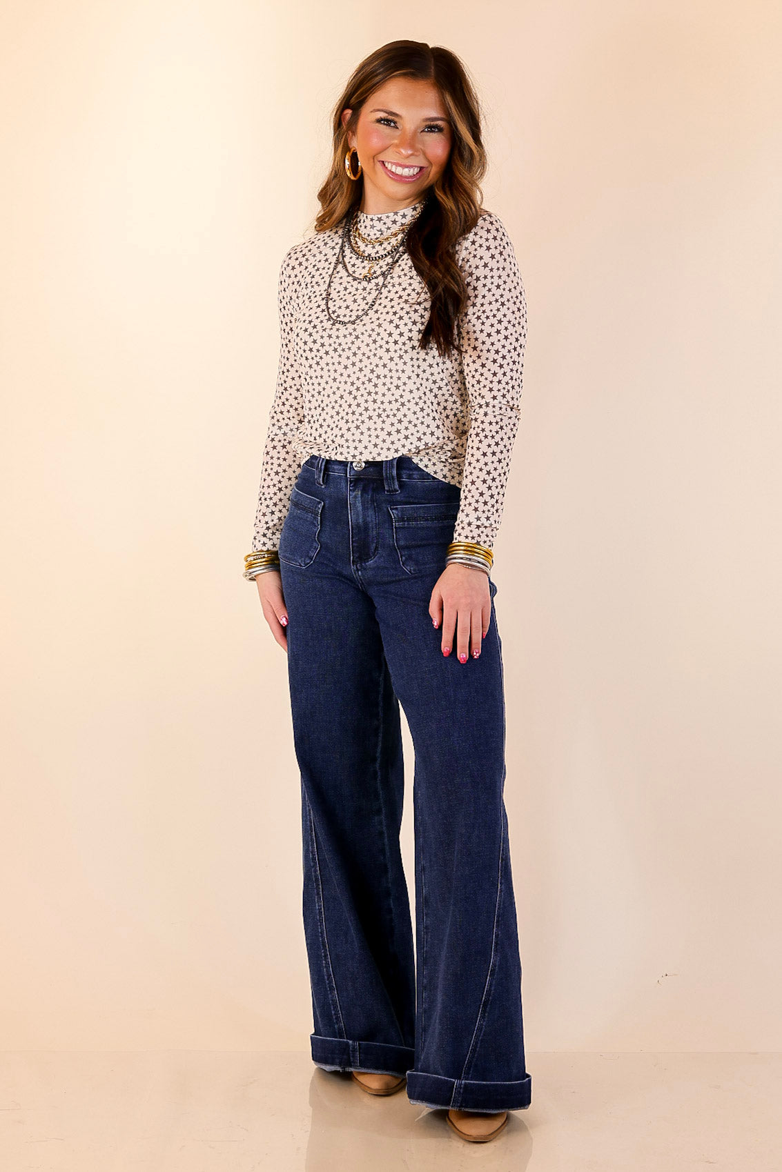 Western Dream Black Star Print Mesh Long Sleeve Top in Ivory