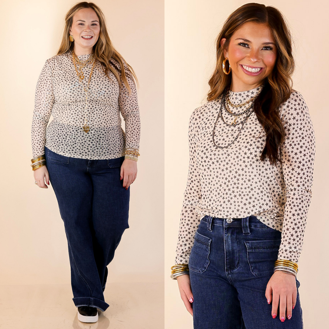 Models are wearing black star mesh long sleeve top in ivory and jeans against a beige background.