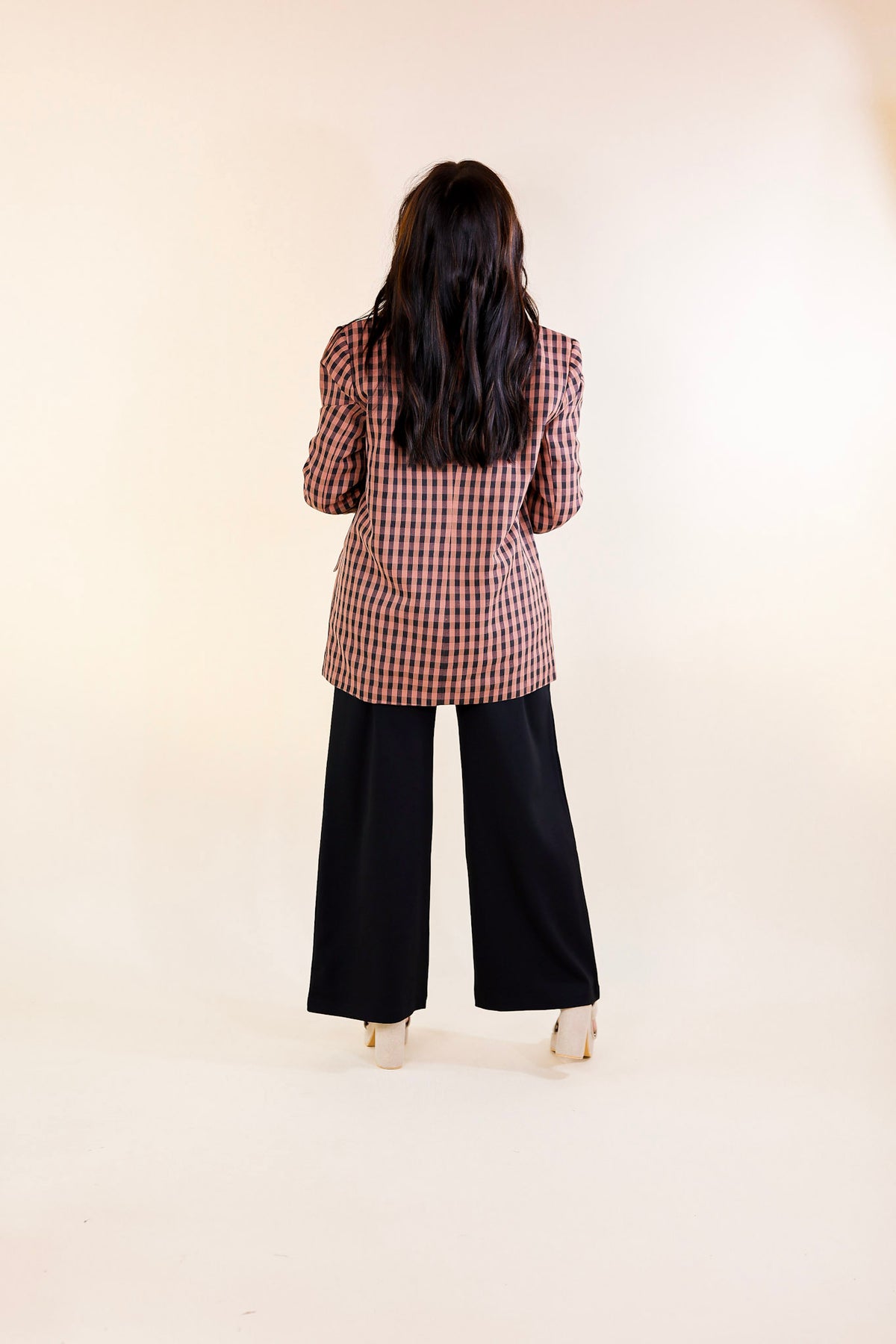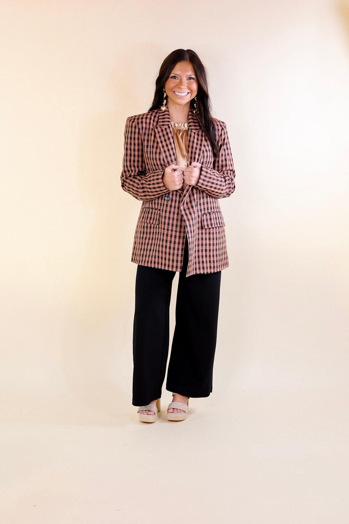 Coffee And Smiles Double Button Plaid Blazer with Long Sleeves in Terracotta Brown and Black