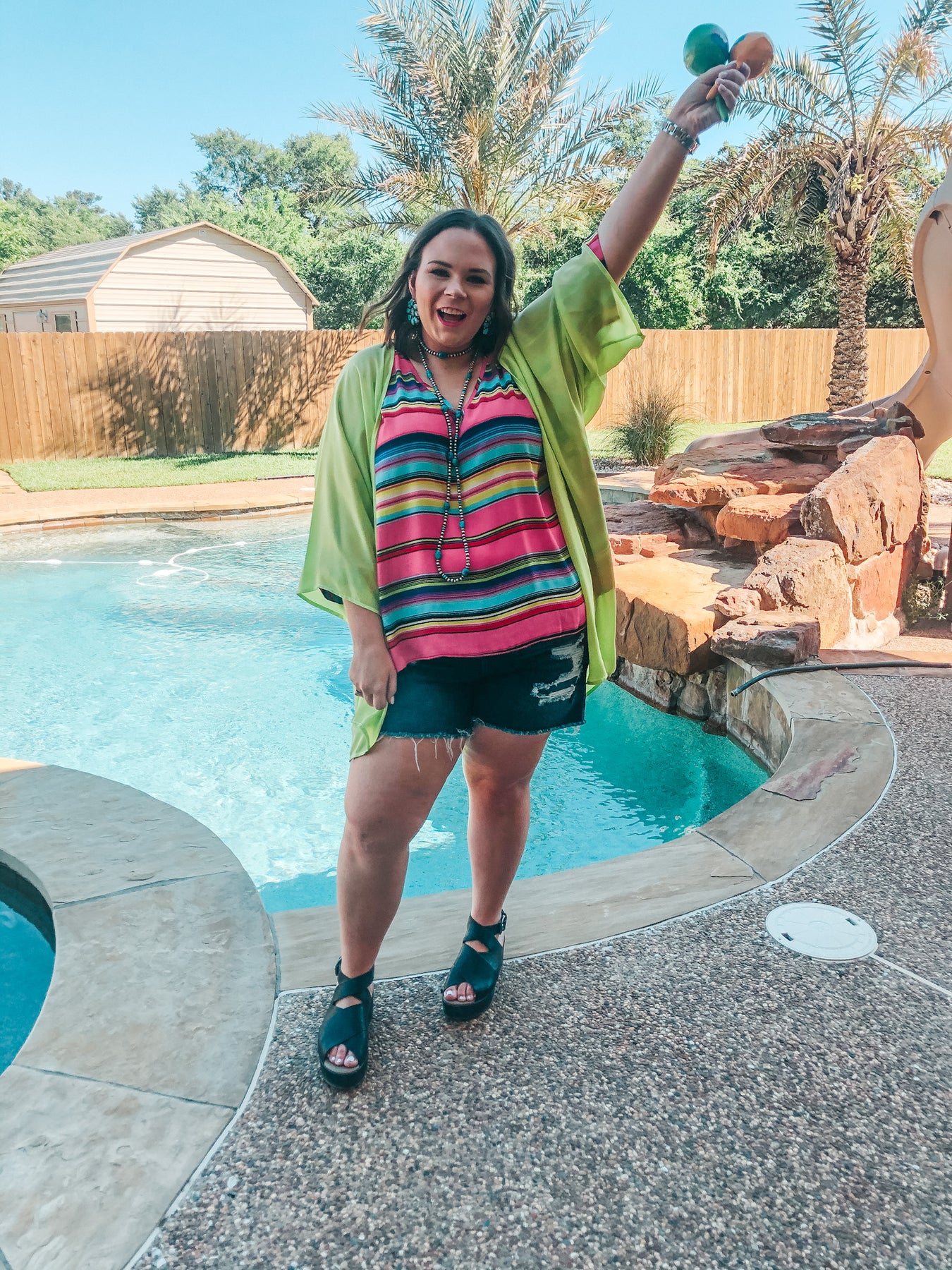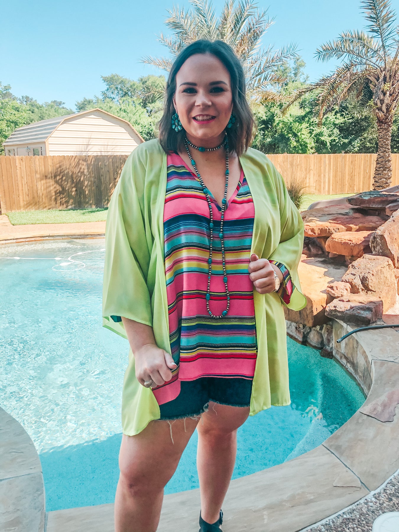 This kimono reminds us of a melody with how beautiful it is! Pair this with swimwear, sweaters, graphic tees, and everything else in your closet! This piece is an essential for the upcoming seasons. Abby is wearing a size large.