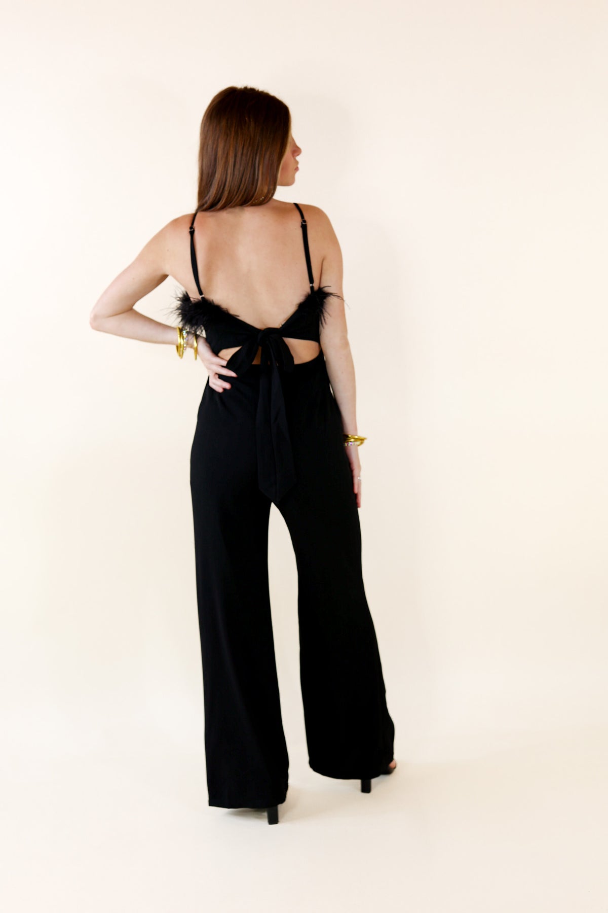 Cue the lights so everyone can see this adorable new jumpsuit! It includes adjustable spaghetti straps, a feather trim, and a v notch in the bodice. The waist tie feature and wide leg pants makes this jumpsuit a show stopper! Arté is wearing a size small.
