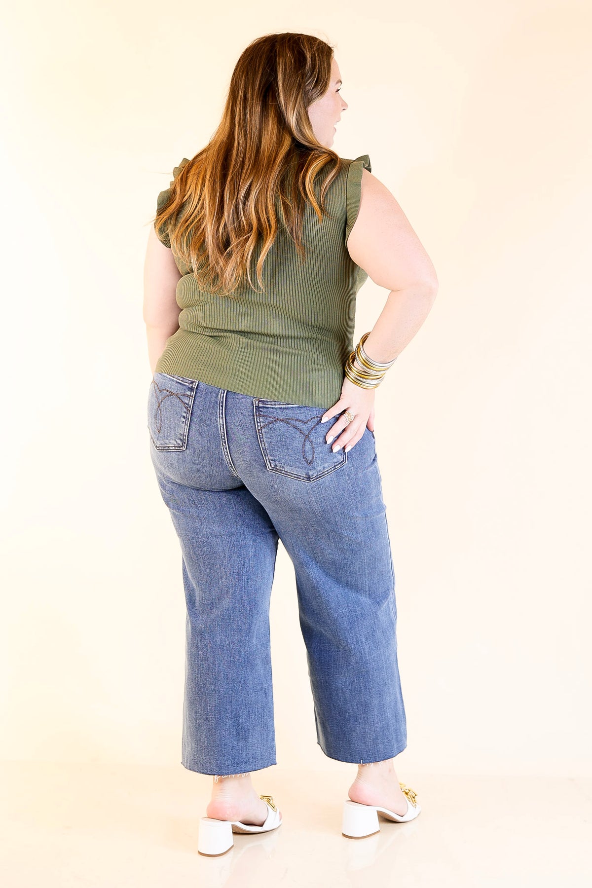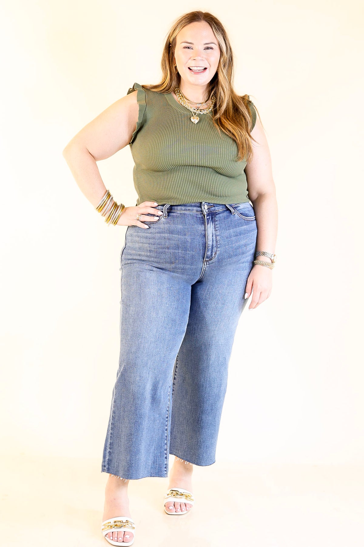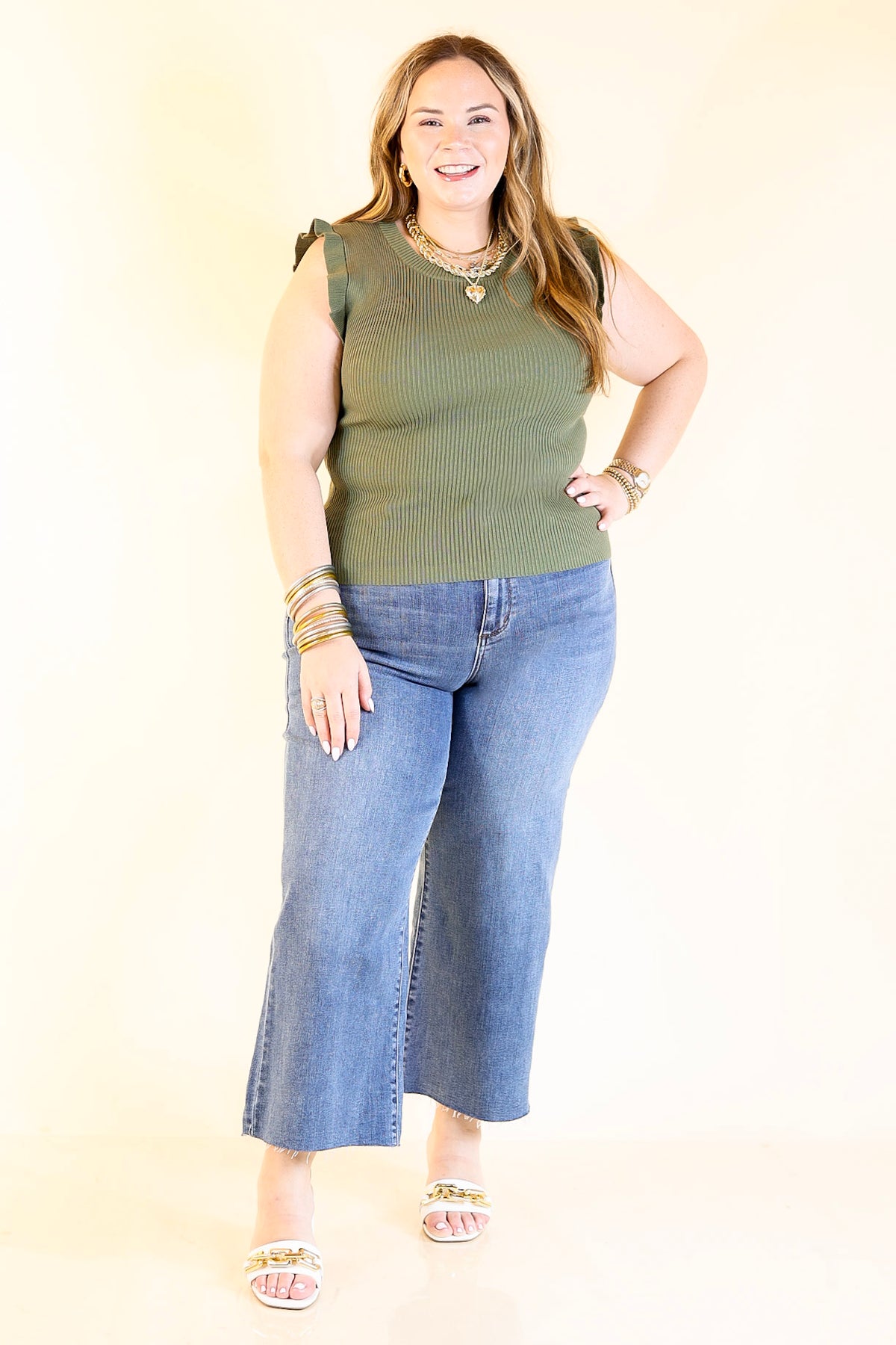 Flirty Frill Scoop Neck Top with Ruffle Sleeves in Olive Green