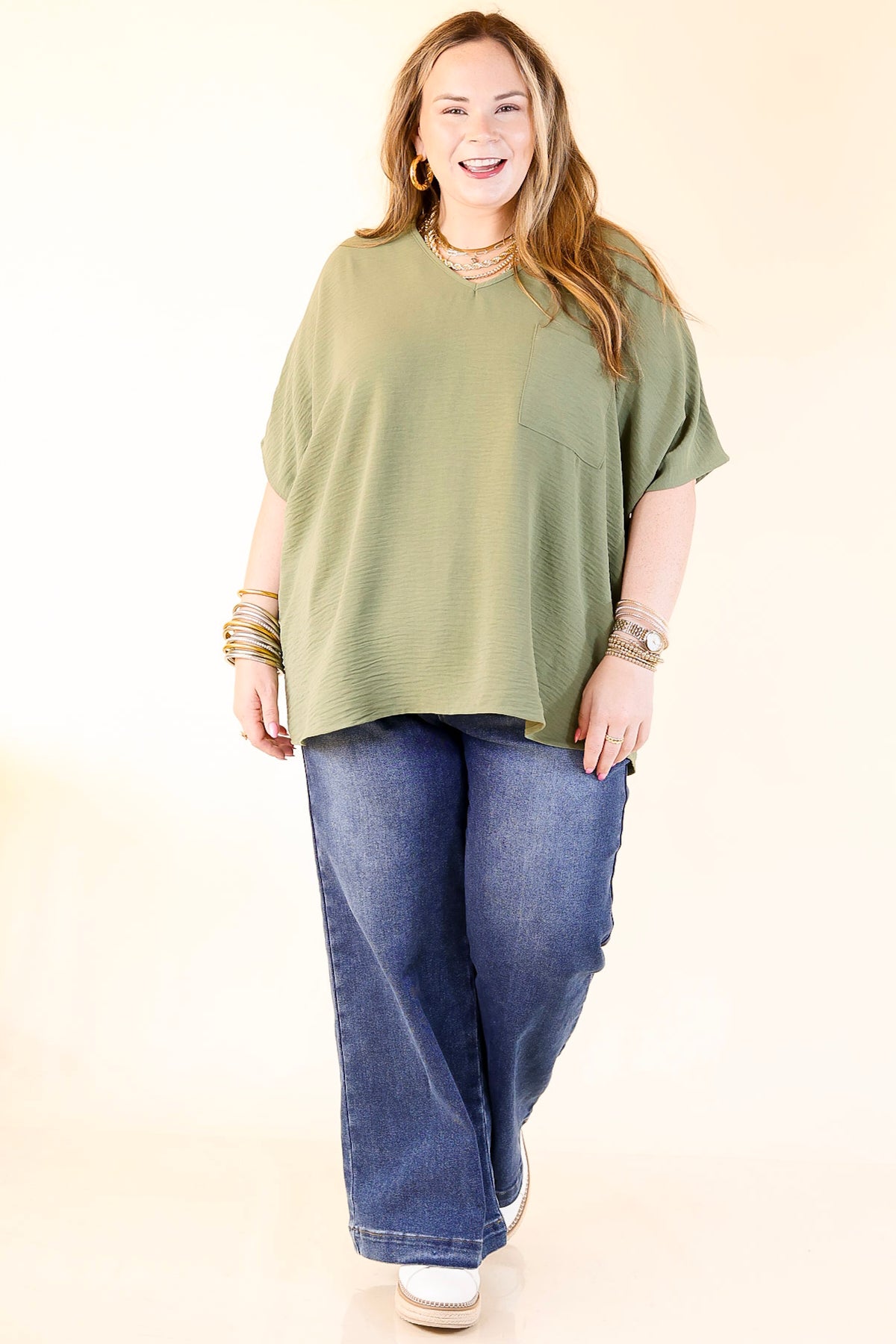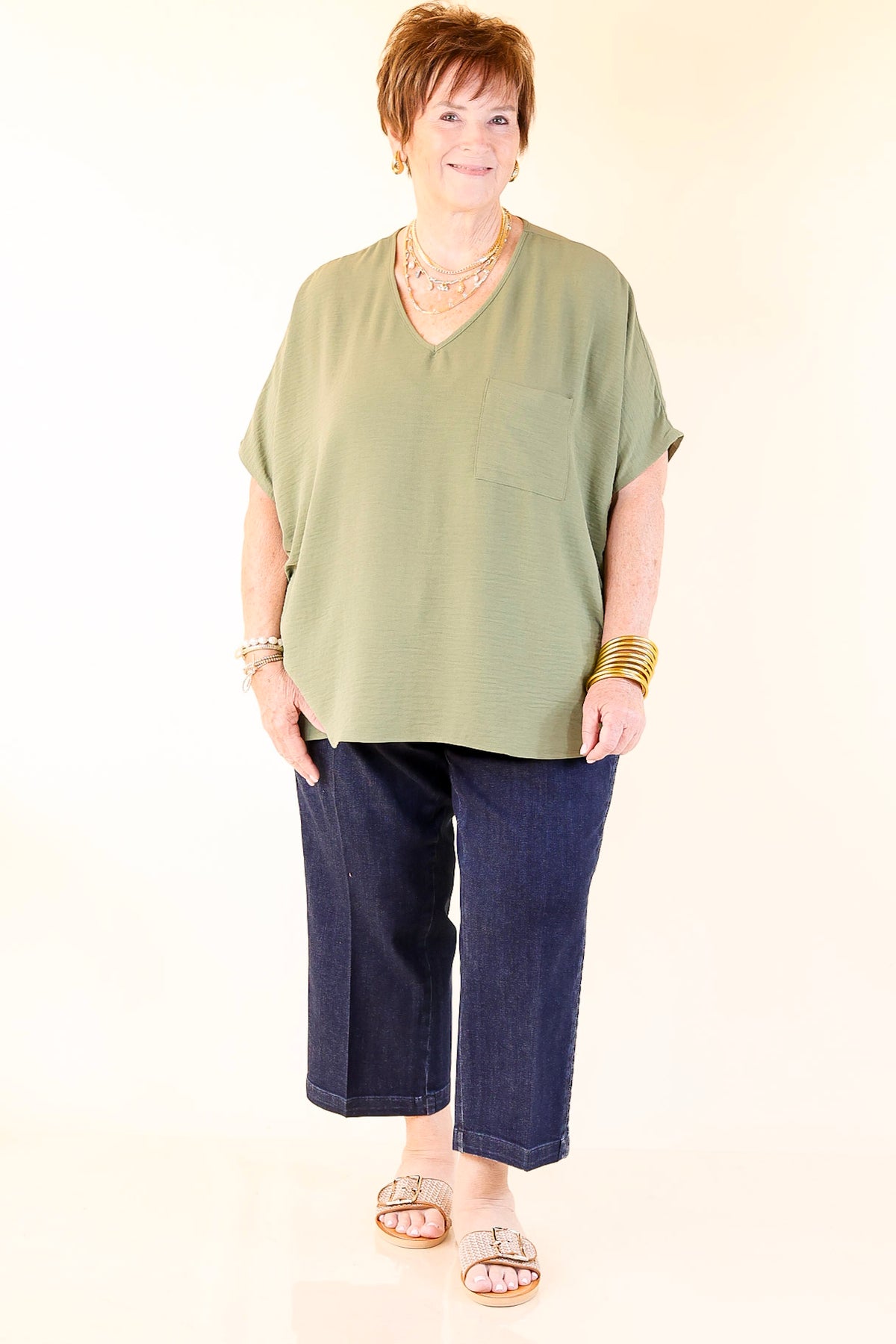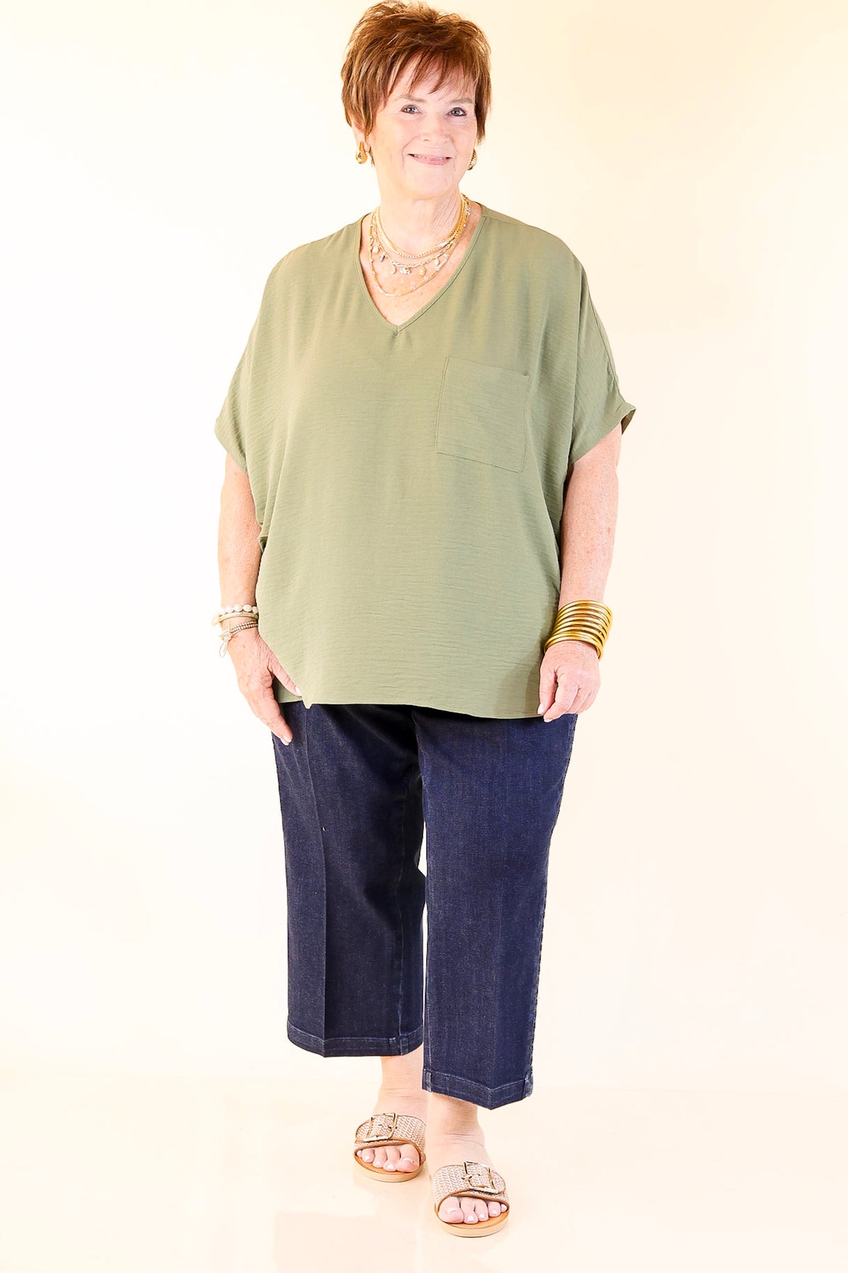 Try To Resist Short Sleeve V Neck Top with Front Pocket in Olive Green