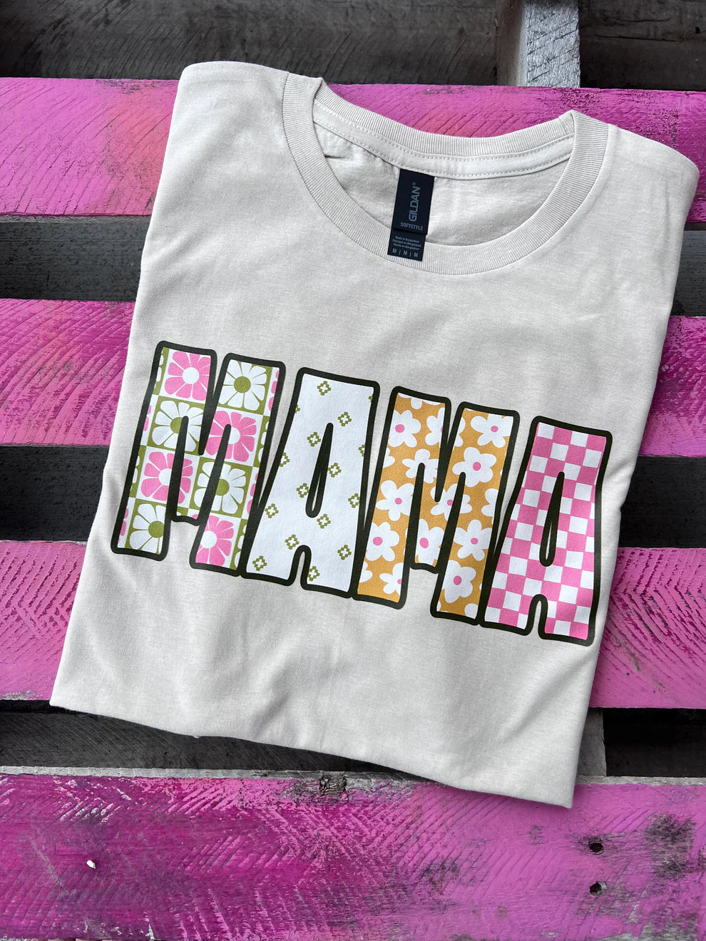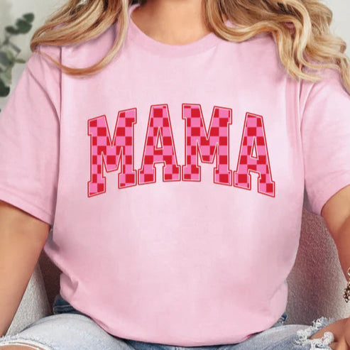 Online Exclusive | Pink Checkered MAMA Graphic Tee in Baby Pink