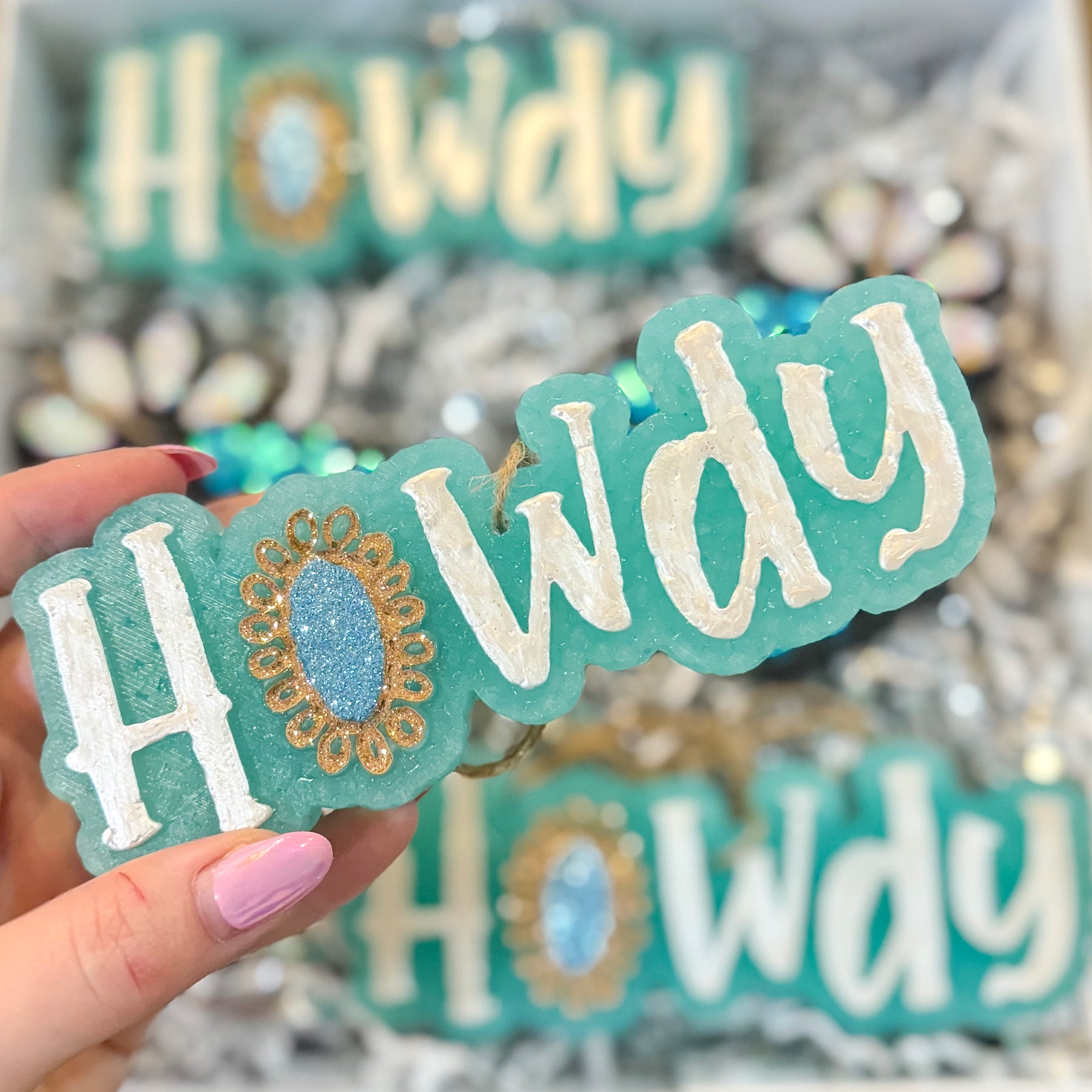 Greet the road with a touch of western charm with our Howdy Car Freshie! This eye-catching sea blue freshie features "Howdy" in elegant pearlescent white lettering, with the "o" creatively designed as a glittery concho. Perfect for adding a fresh scent and a stylish flair to your vehicle, this car freshie is both functional and fashionable. Keep your car smelling great while showcasing your unique personality. Available in a variety of delightful scents to choose from, the Howdy Car Freshie is the perfect accessory for any car. Grab yours now and ride in style!