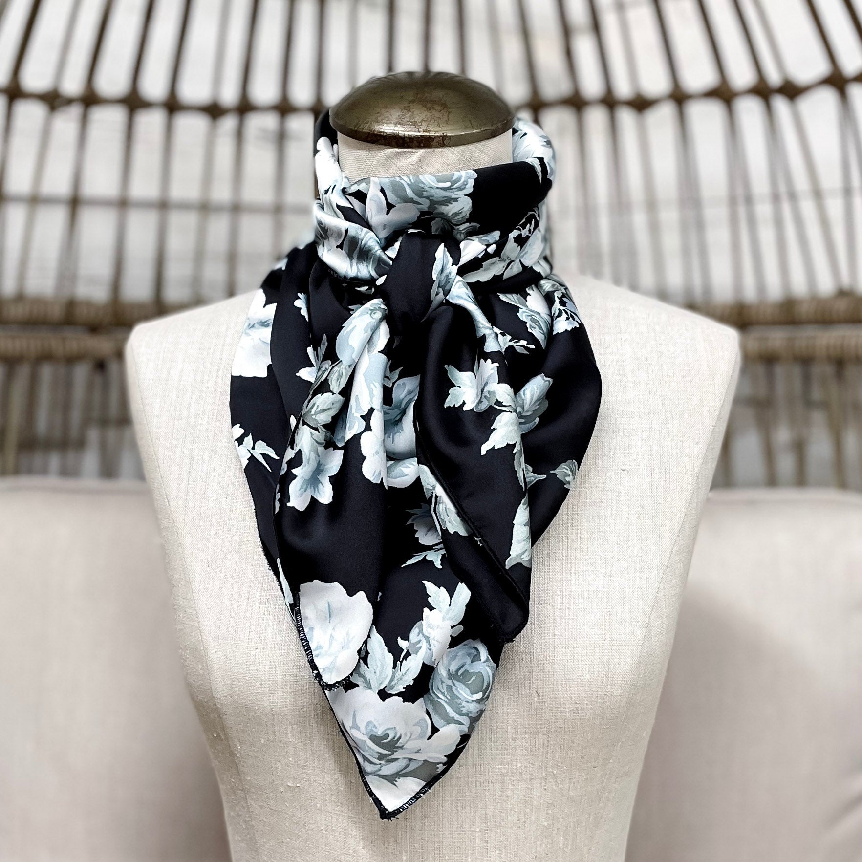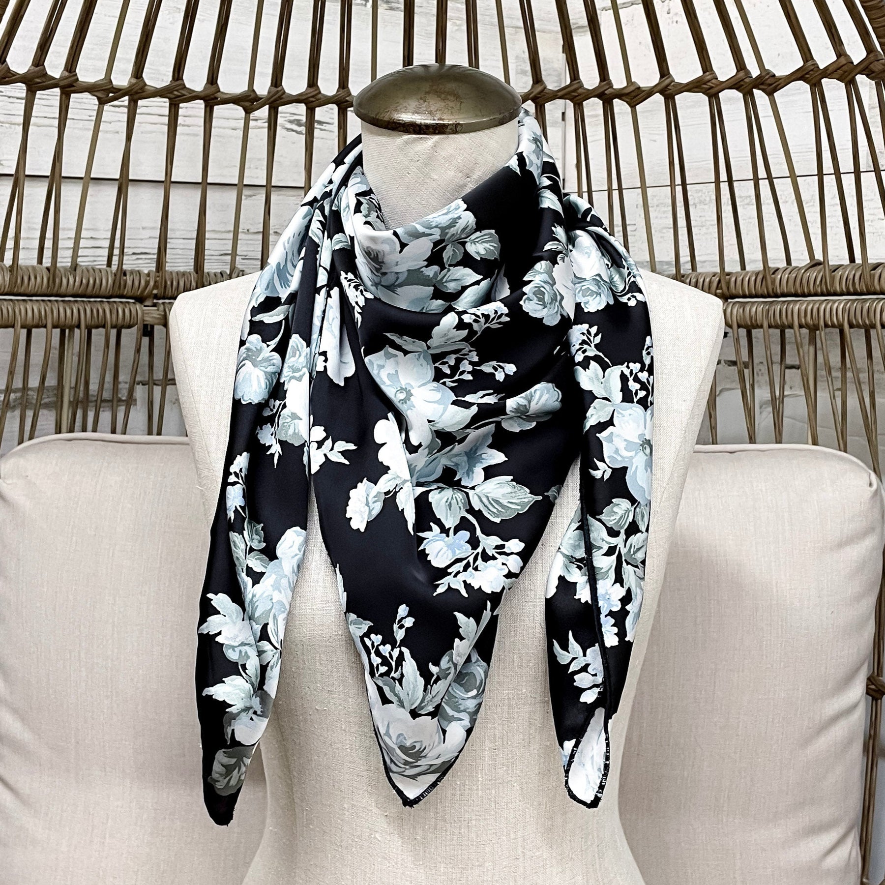 Embrace your adventurous side with the Buck Wild | Moonlit Petals Wild Rag in Black. Featuring a sleek black background adorned with delicate white and grey flowers, leaves, and swirling vines, this wild rag brings a touch of moonlit magic to any outfit. Perfect for adding a bit of edge and elegance, it’s crafted with care in Huntsville, Texas, ensuring quality you can trust.