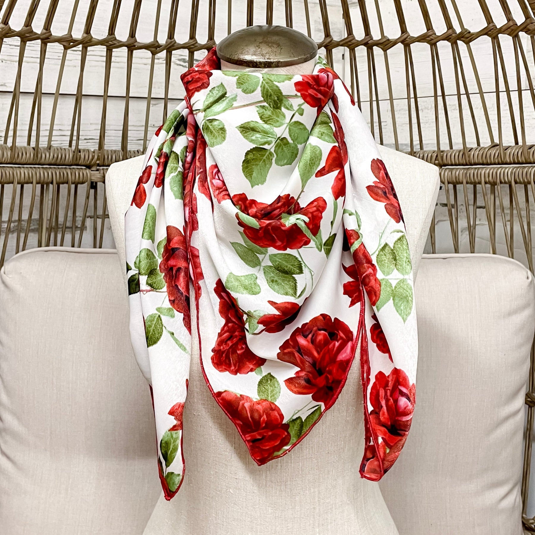 Add a splash of bold charm to your outfit with the Buck Wild | Run for the Roses Wild Rag in White. Featuring a crisp white background adorned with vibrant red roses and lively green leaves, this playful accessory brings a fresh, wild spirit to your look. Crafted with care in Huntsville, Texas, it blends classic floral elegance with a touch of daring flair—perfect for those ready to stand out in style.