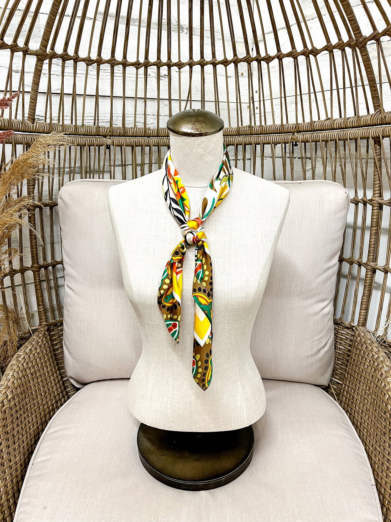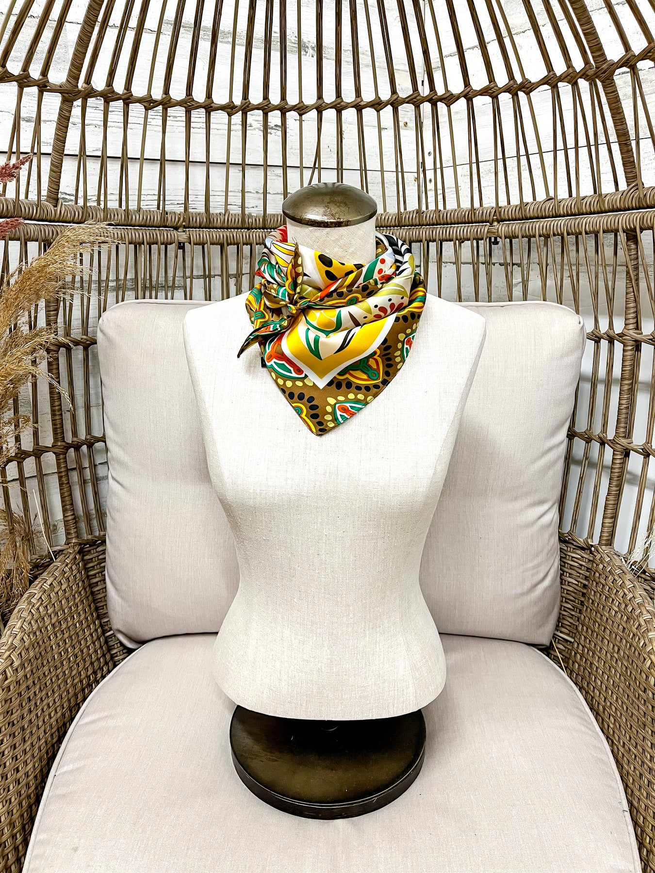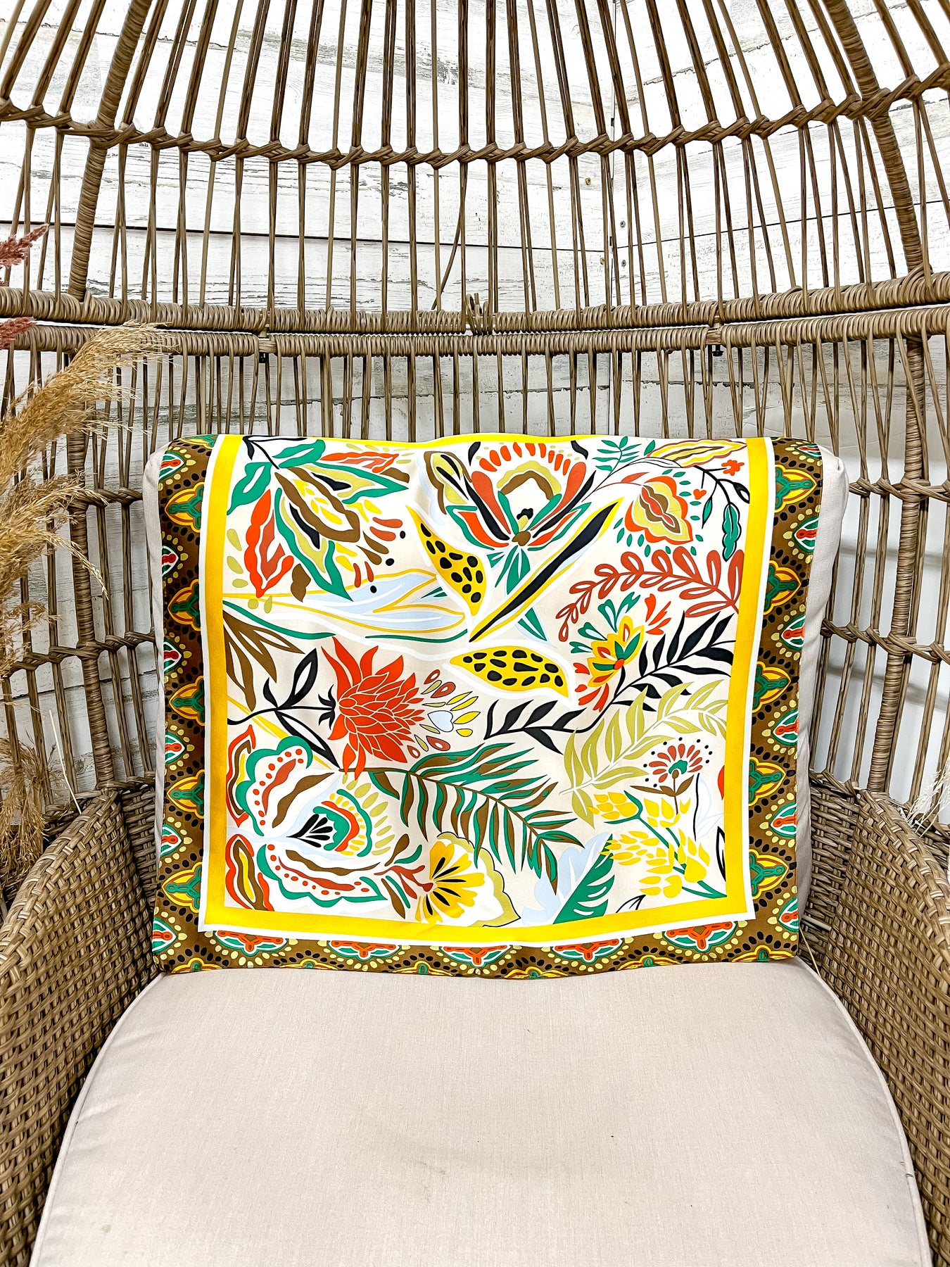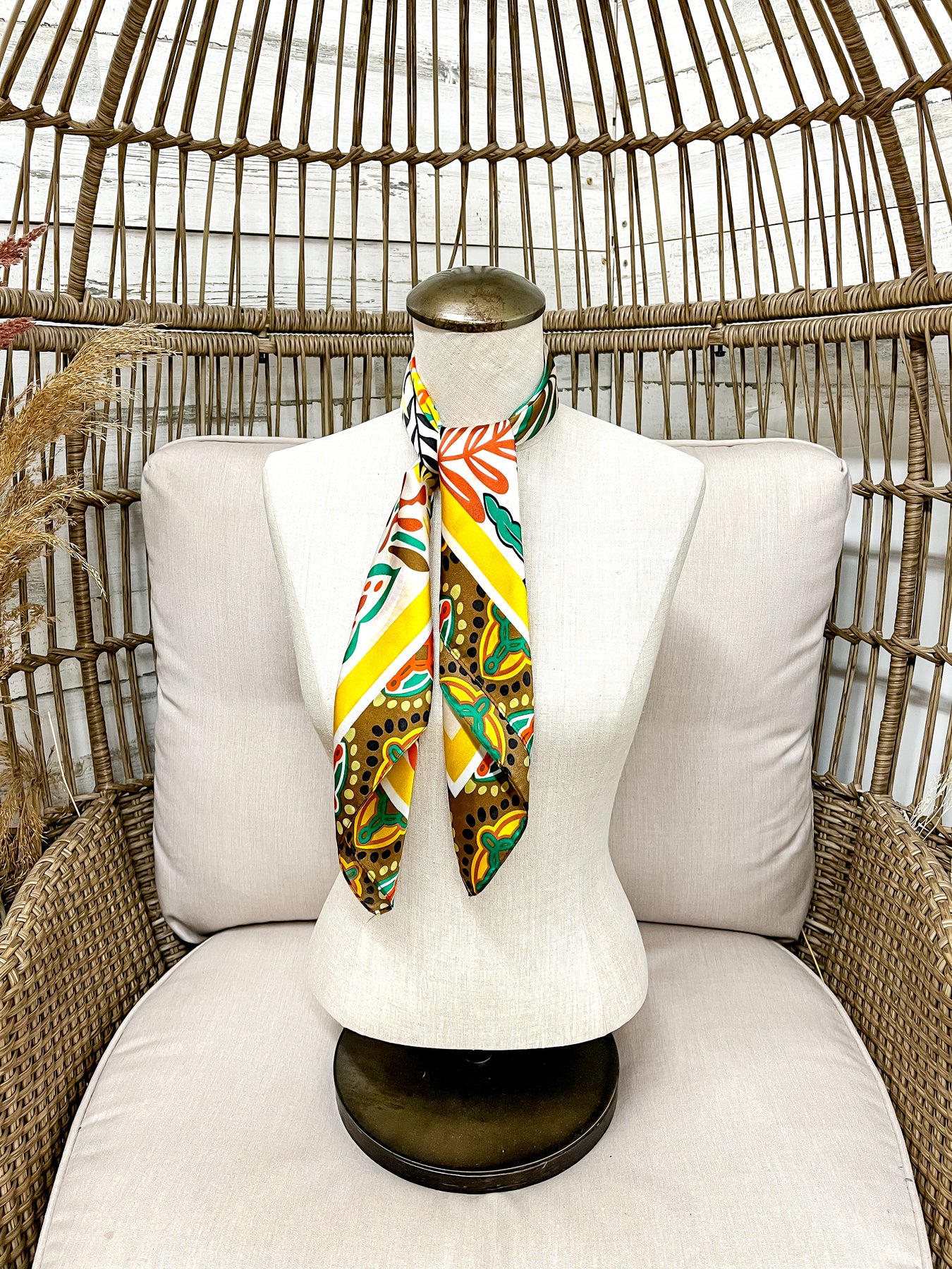 Meet your new fall favorite — the Golden Harvest Floral Scarf! Featuring a stunning mix of mustard yellow, olive green, rust orange, and warm ivory, this silky scarf captures all the cozy hues of autumn in one chic accessory. The bold floral print pops with vintage western charm, perfect for dressing up any outfit this season.