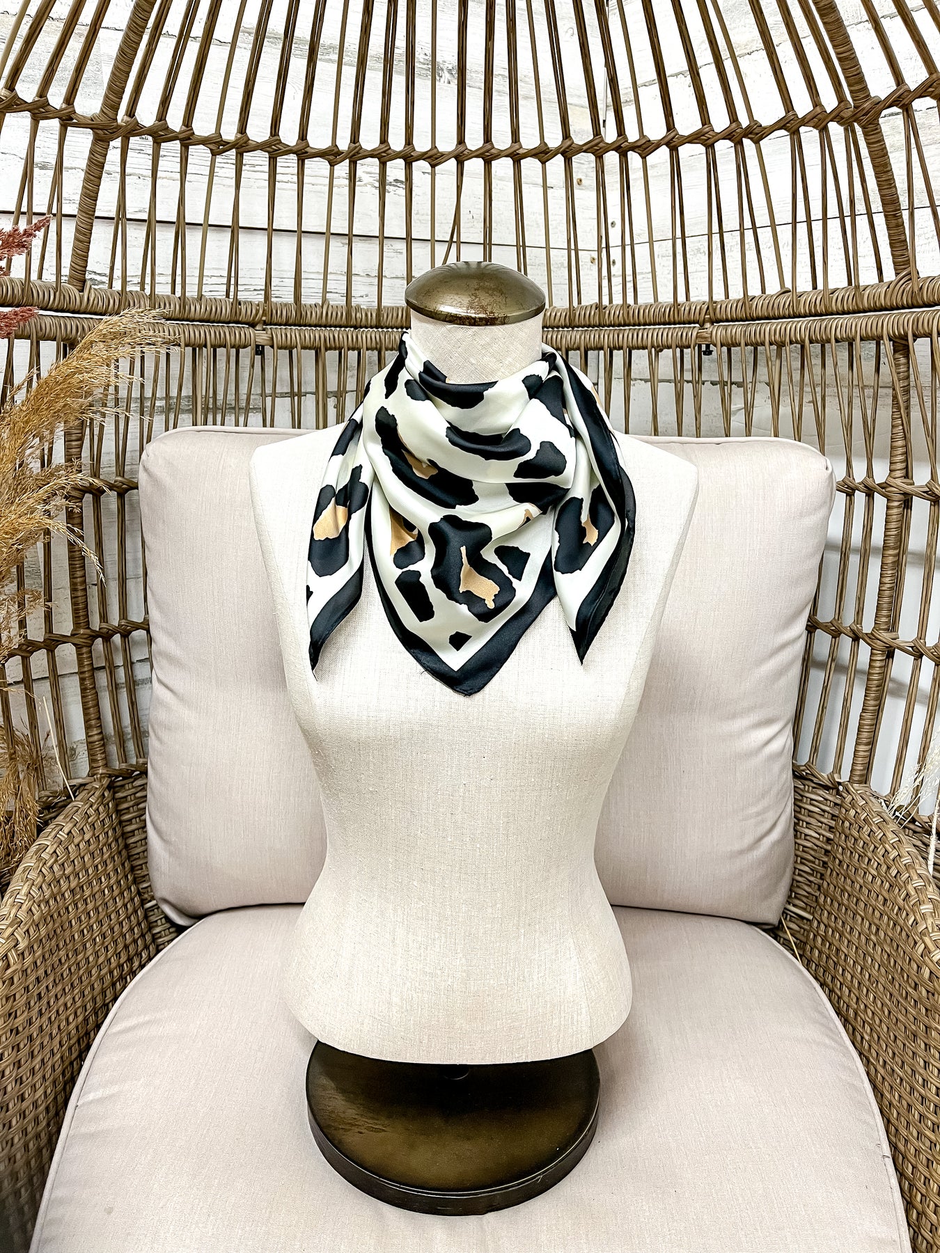 Wild Chic Black and Ivory Large Leopard Print Silk Feel Square Scarf in Leopard