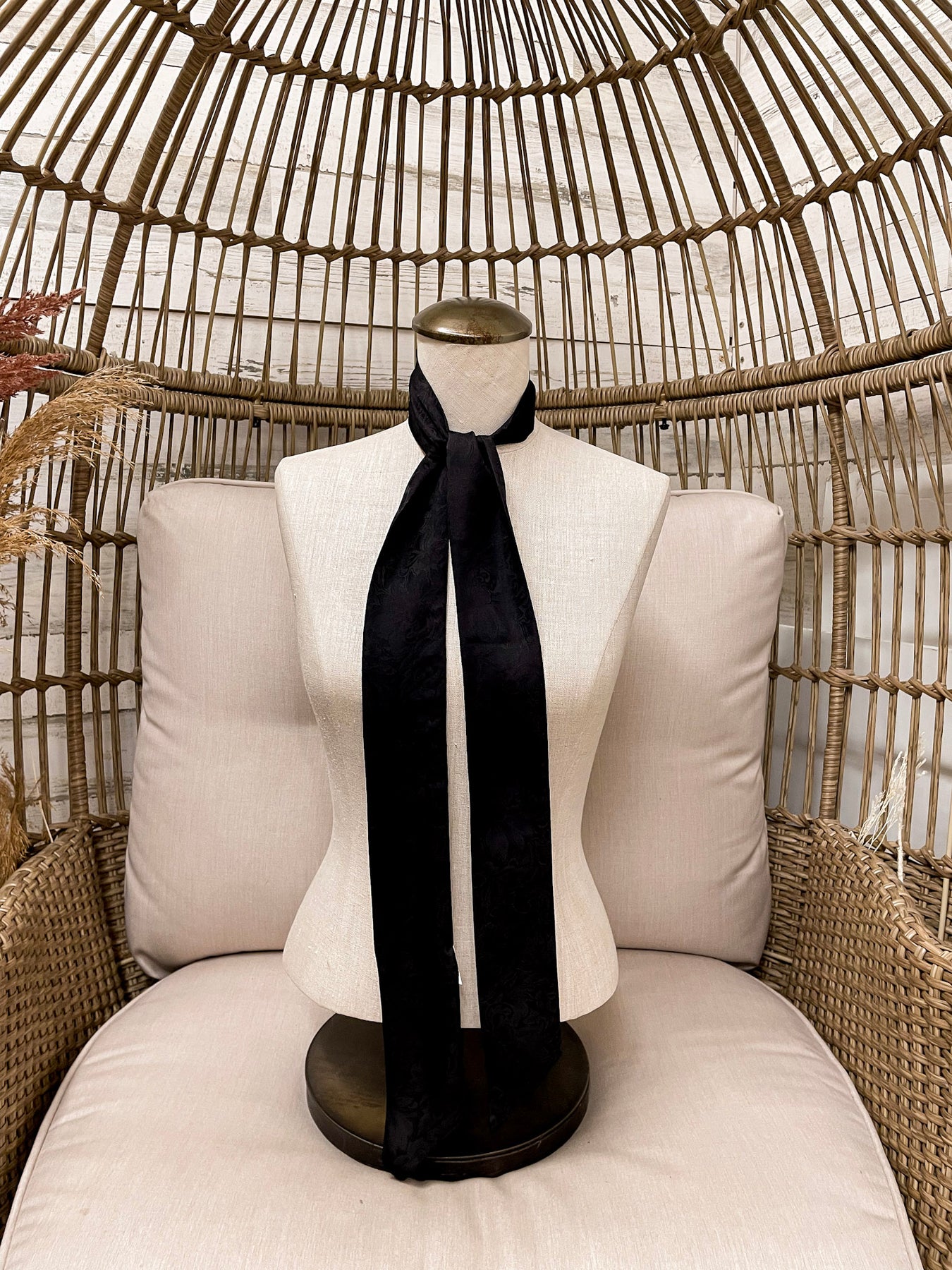 The Jacquard Black Silk Twilly Scarf by Wyoming Traders is the definition of understated elegance. Crafted from smooth silk with a subtle jacquard texture, this piece adds depth and dimension while keeping a sleek, monochromatic look.