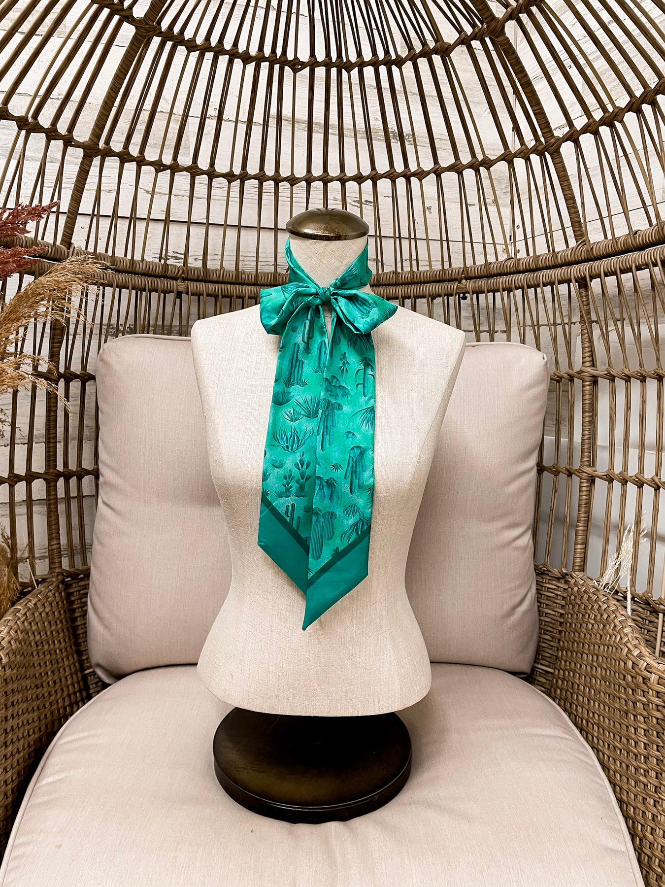 The Southwest Cactus Silk Twilly Scarf by Wyoming Traders brings a fresh, modern take on Western style. Featuring an allover cactus motif in rich turquoise tones, this piece blends desert-inspired design with polished elegance.
