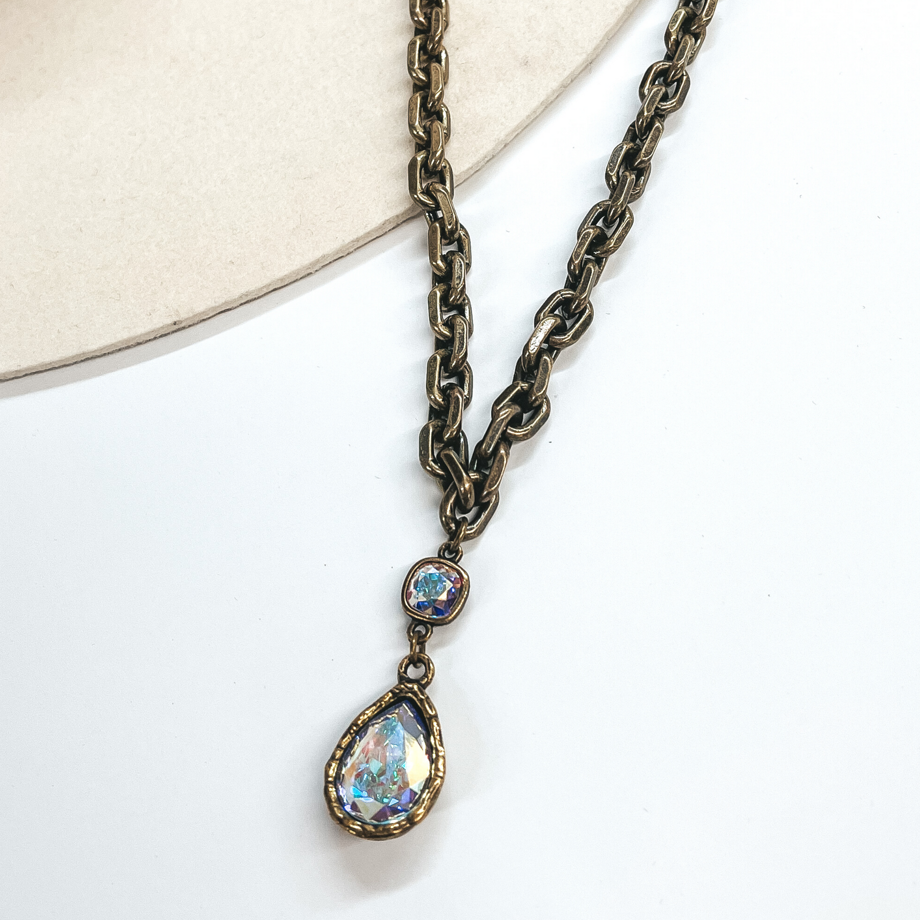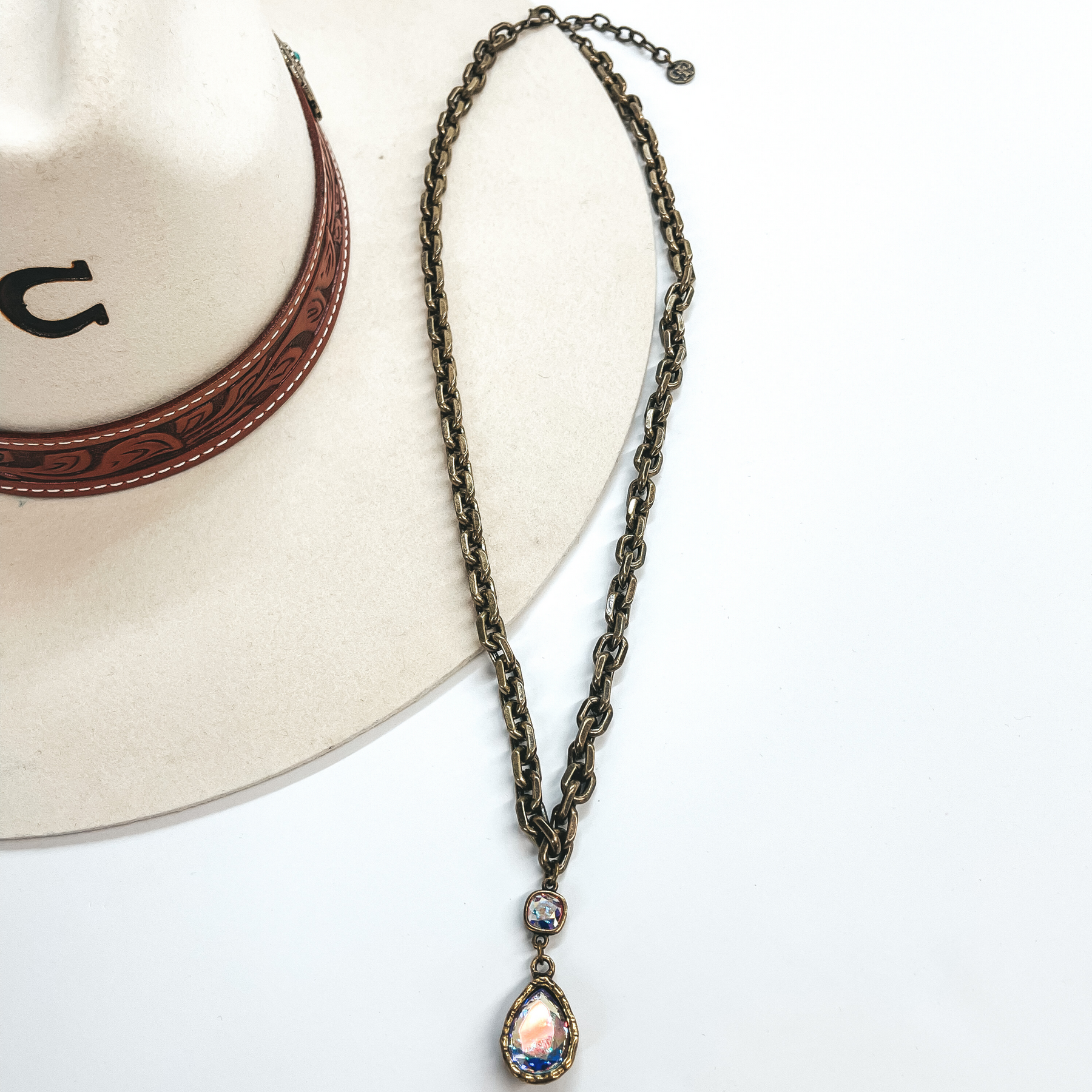 Pink Panache | Chunky Chain Necklace with AB Crystal Teardrop and Small AB Cushion Cut Crystal in Bronze