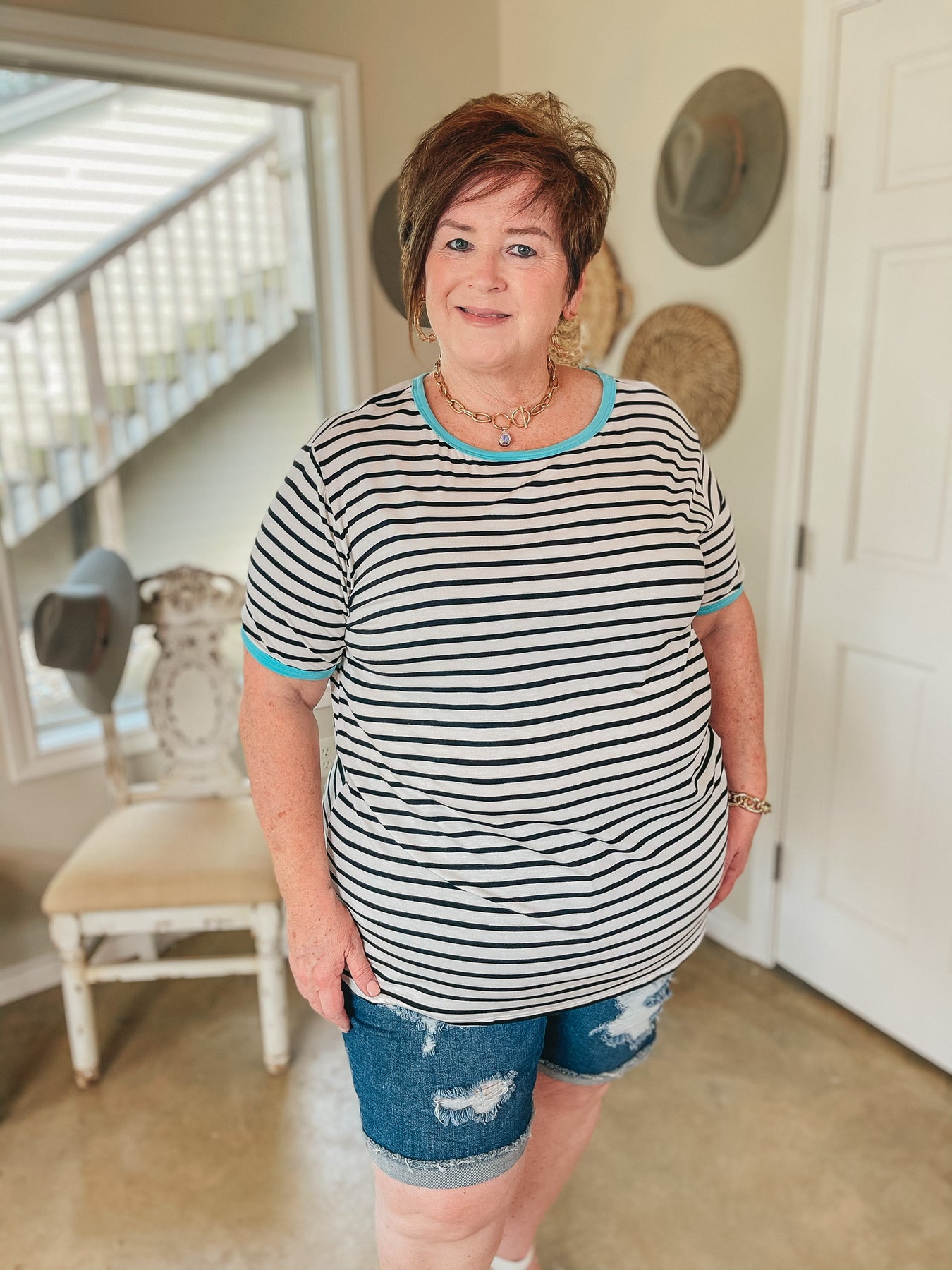 This adorable top is reminding us of a peaceful Sunday! It includes black and white stripes, a mint trim, a crew neckline, and short sleeves. Pair it with shorts or boyfriend jeans and you're set! Lily is wearing a size small. Abby is wearing a size large. Nancy is wearing a size 2XL.