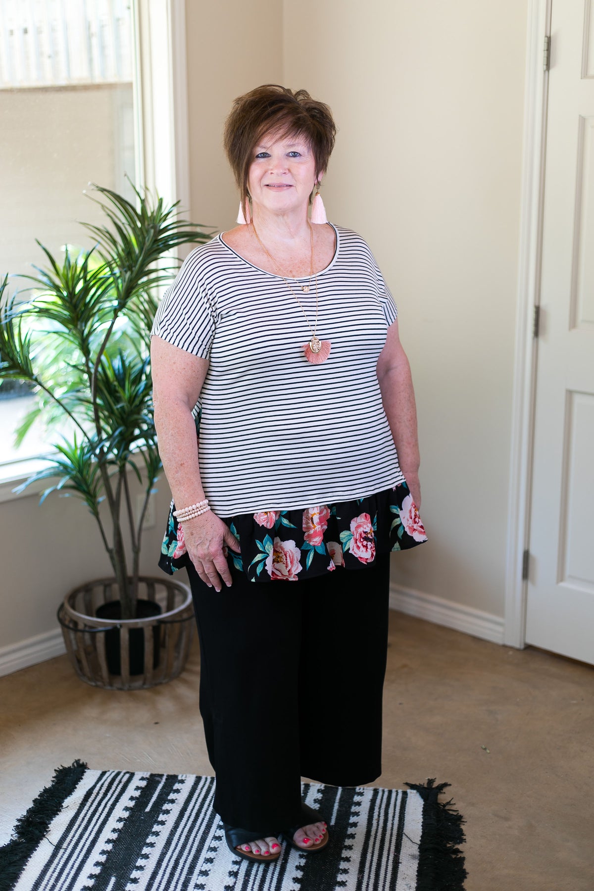 When stripe and floral print collide, you know you're well balanced. Mixing patterns has been a huge trend and is super cute. Top features a scoop neckline, short sleeves and has a floral print ruffled trim. Top is flowy through the bottom and would also look cute with leggings. Mallory is wearing size small. Nancy is wearing size 2XL.