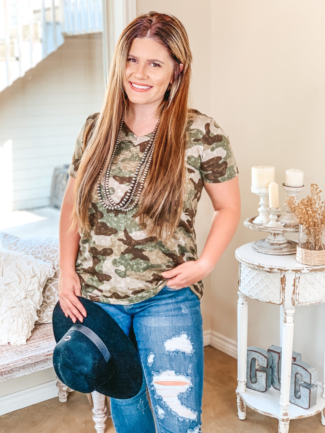 Last Chance Size Small & Medium | Keep Things Simple Camouflage V Neck Tee in Olive Green