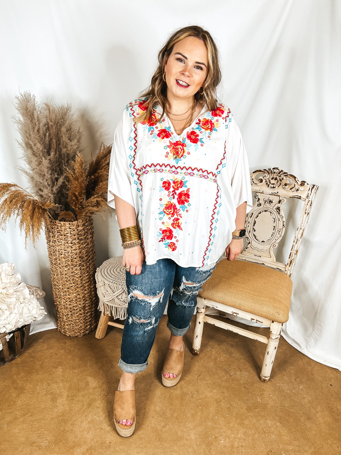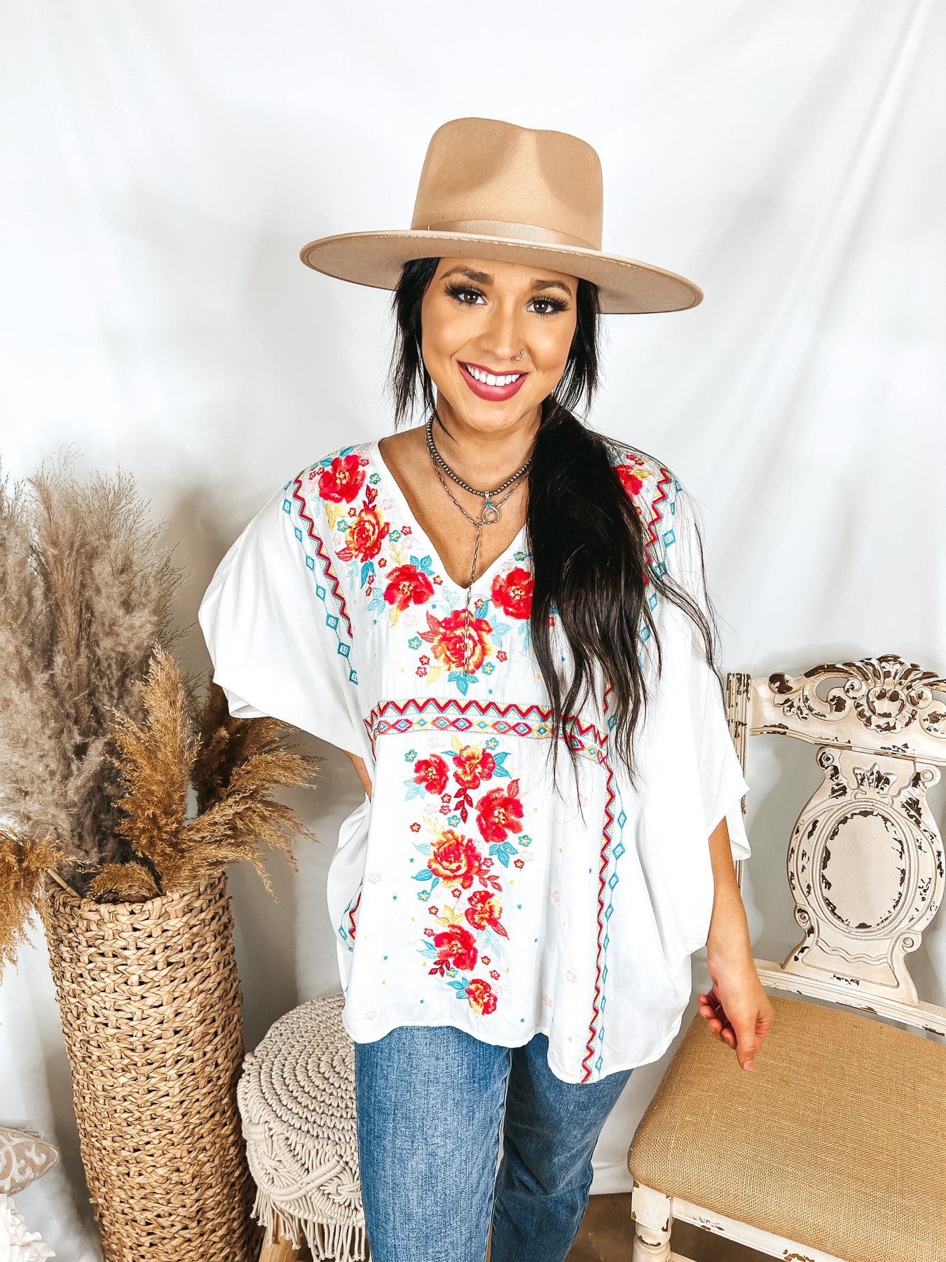 More To The Story Floral Embroidered Poncho Top in White