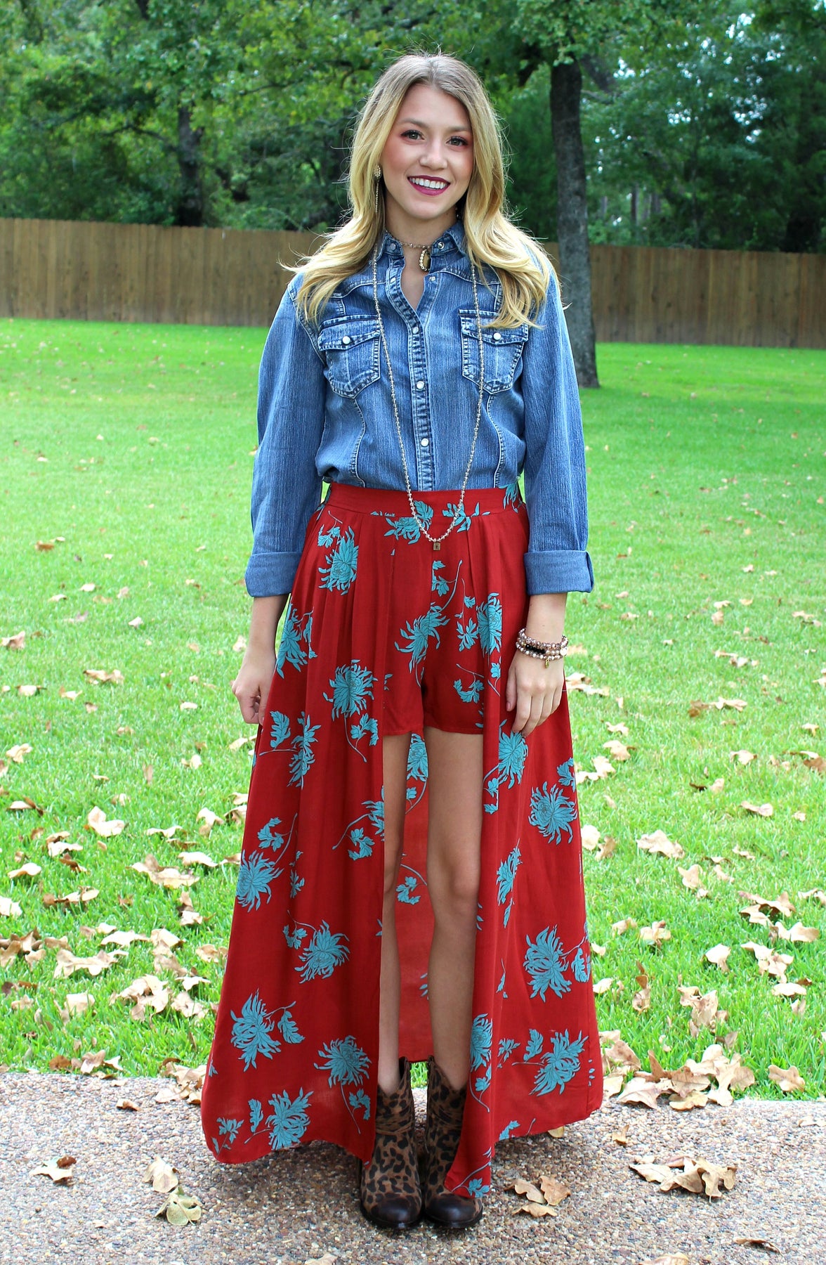 This outfit is going to demand all the perfect compliments that you've wanting - it's just too perfect!  A beautiful turquoise floral on the brick red fabric creates an overlay adorned with pleated waist, fully lined shorts and an elastic waistband. Model is wearing size small.