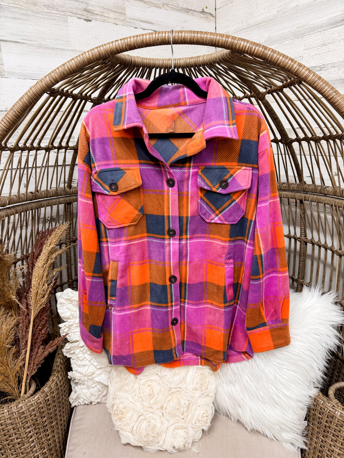 Plaid Button Up Fleece Shacket with Pockets in Pink, Orange and Navy