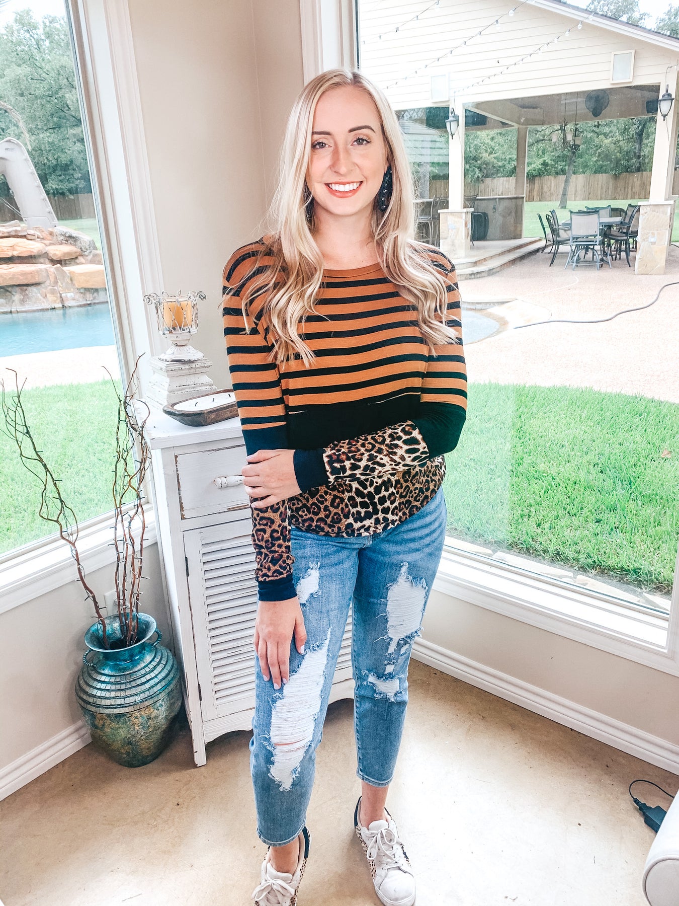 Say hello to your new favorite top! Perfect to throw on with your favorite pair of jeans or even a pair of black leggings! This top includes a stripped upper and a leopard bottom. It has long sleeves and a black stripe around the elbows and wrists. Mallory and Josie are wearing a size small. Abby is wearing a size large. Nancy is wearing a size 2XL.