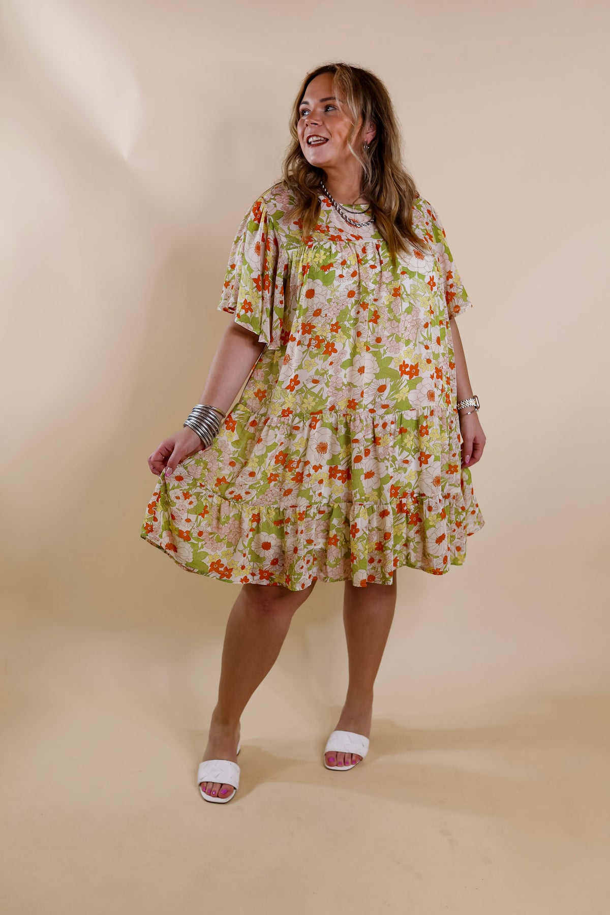 Last Chance Size Small | State of Bliss Ruffle Tiered Floral Dress in Lime Green and Orange