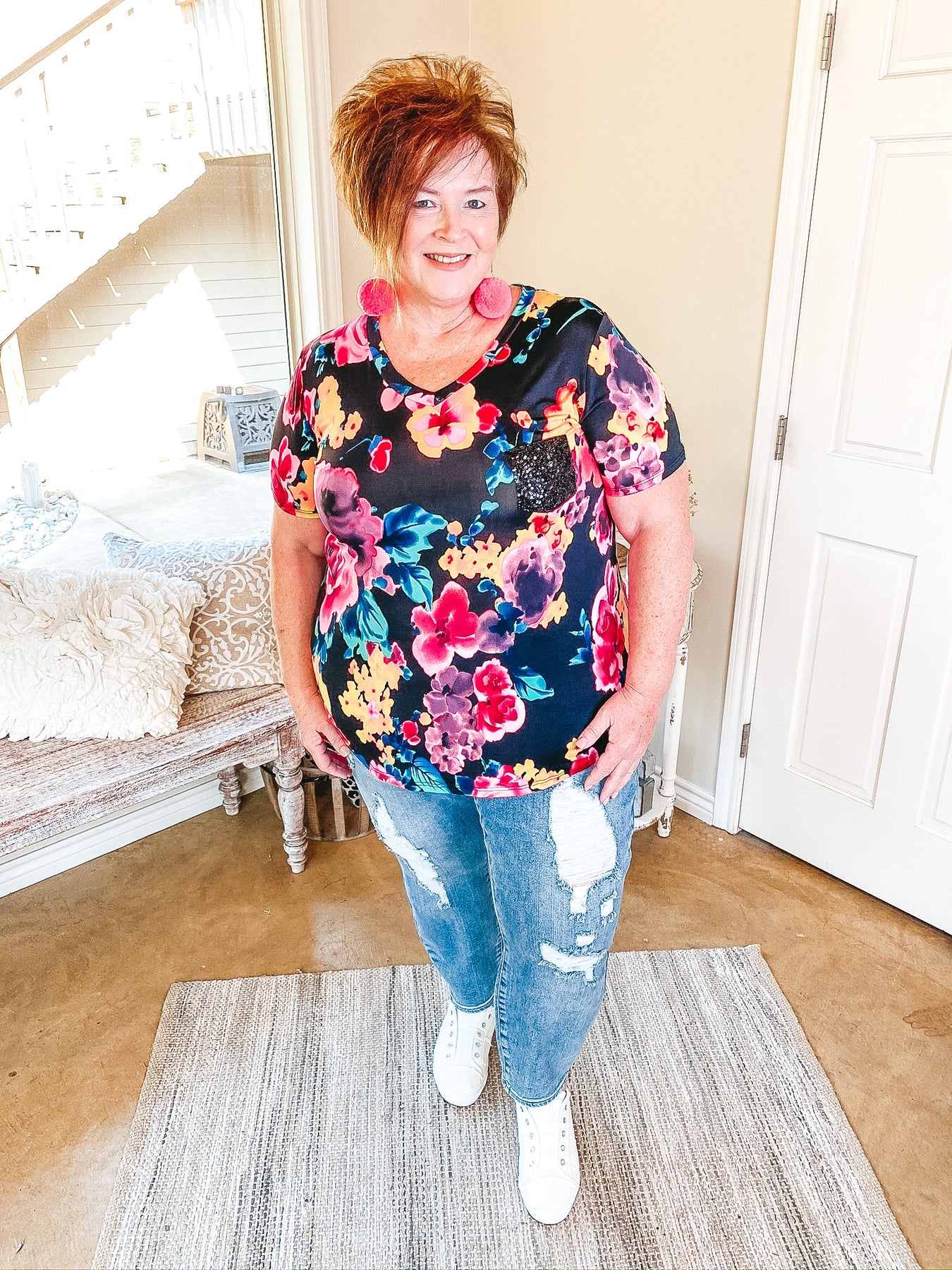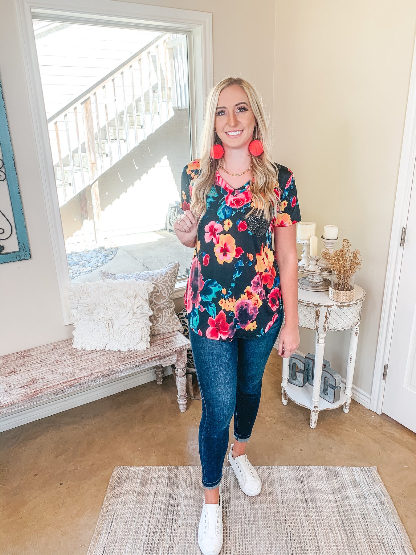 You've seen our Just Right Pocket Tee, well we've got it back and better than ever! You'll Sparkle Just Right in this cute tee! ;) This top features short sleeves, a v-neckline, and a black sequin pocket on the front. The bright and colorful floral print is sure to make you stand out! Josie is wearing a size small. Abby is wearing a size large.
