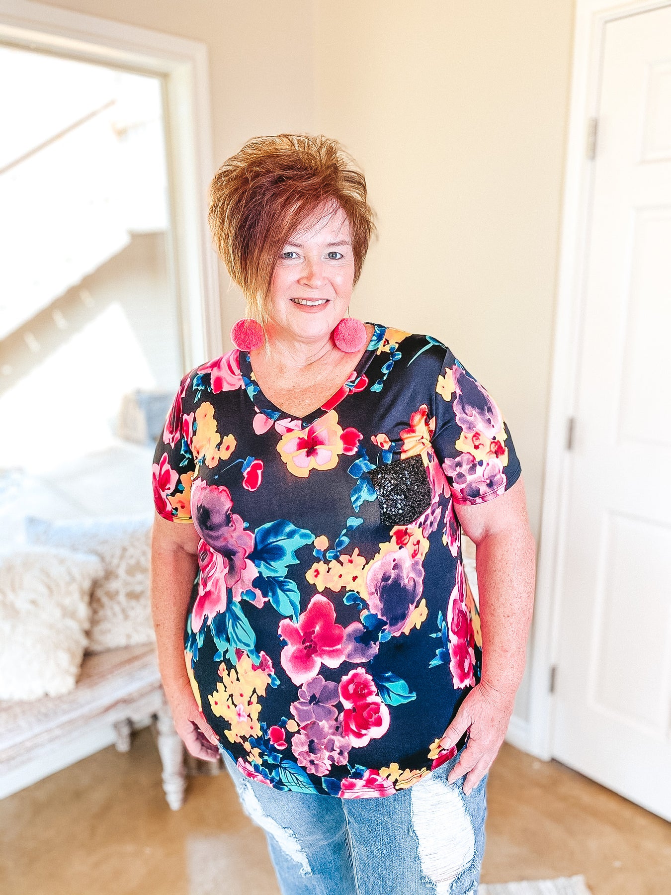 Last Chance Size Small | Sparkle Just Right Floral Sequin Pocket Tee in Black