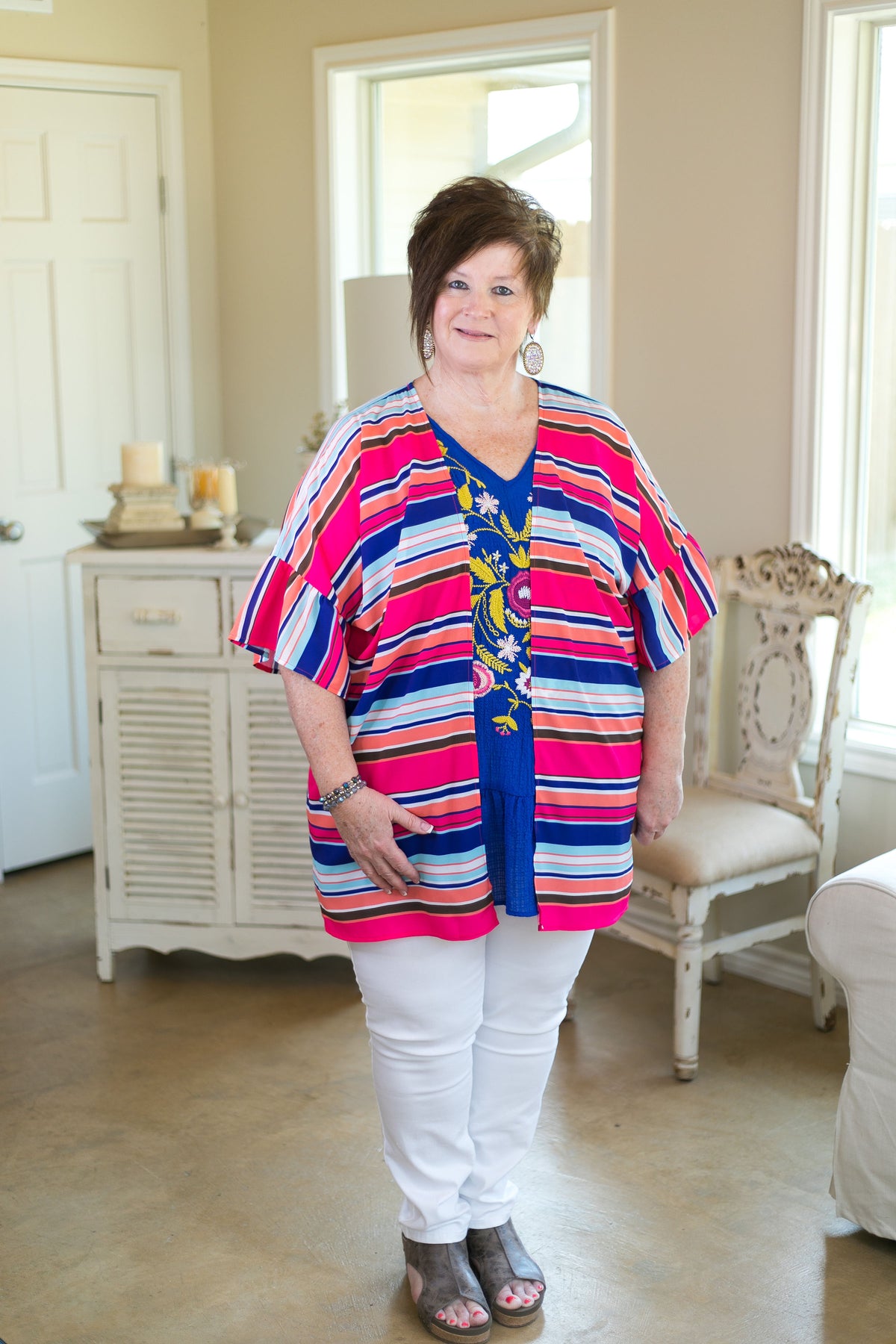 This beautiful, vibrant kimono features an open front, short sleeves with ruffles and stripe print in hot pink, white, royal blue, light blue and coral.  Mallory is wearing size small.  Nancy is wearing size 2XL.
