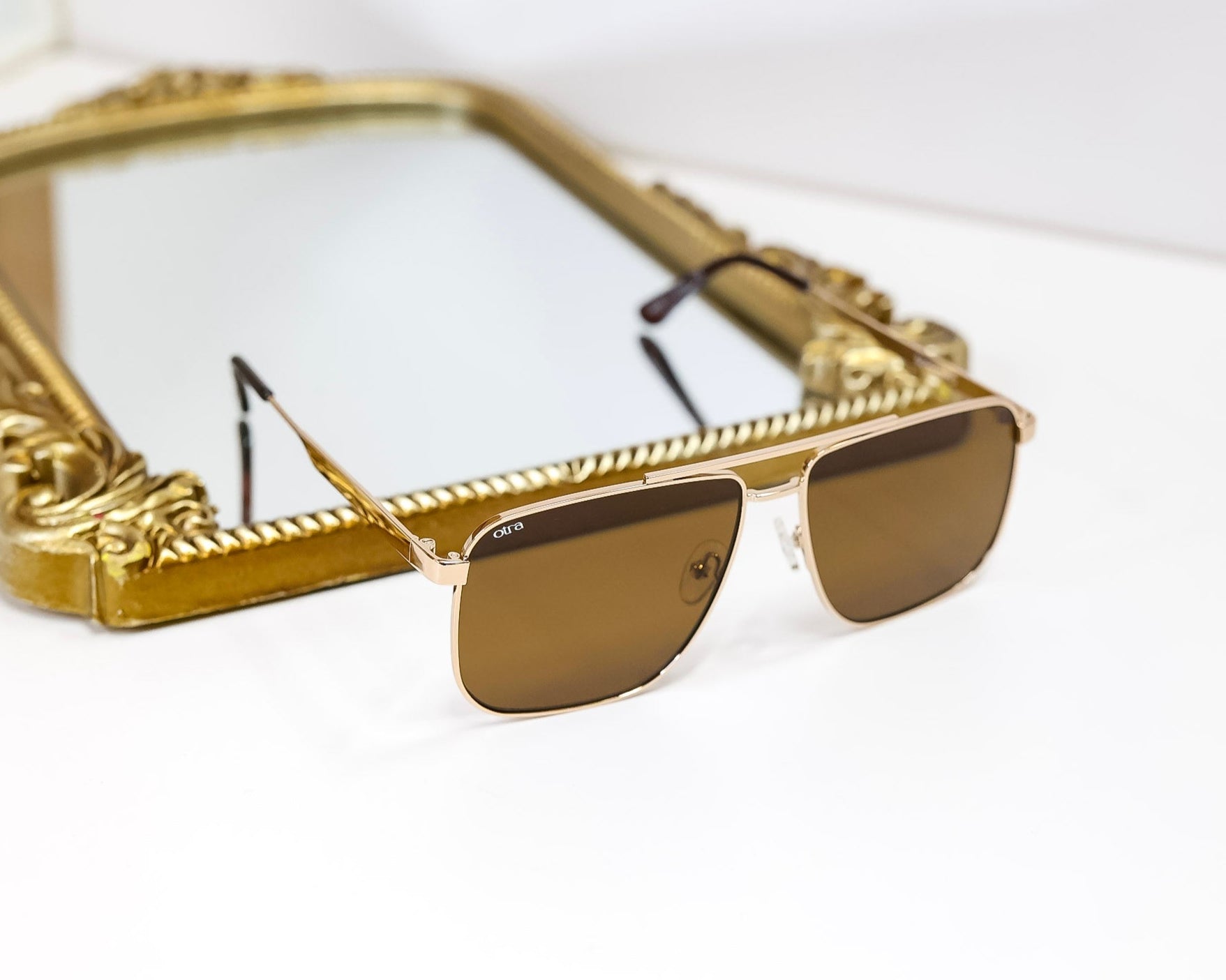 An oversized squared aviator in polished gold metal, paired with warm brown lenses. The bold geometric silhouette blends vintage attitude with modern sophistication — a statement piece with effortless edge.