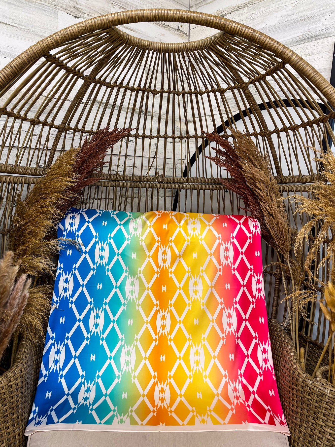 Introducing the Aztec Rainbow Wild Rag! Embrace its colorful Aztec print for a bold and stunning addition to your outfit. Made of shiny and beautiful 100% polyester, this versatile 36" by 36" rag can be worn in a variety of ways to make any look stand out. Show off your style with this must-have accessory. This Wild Rag/Scarf is easy to take care of, and can be worn for any season!