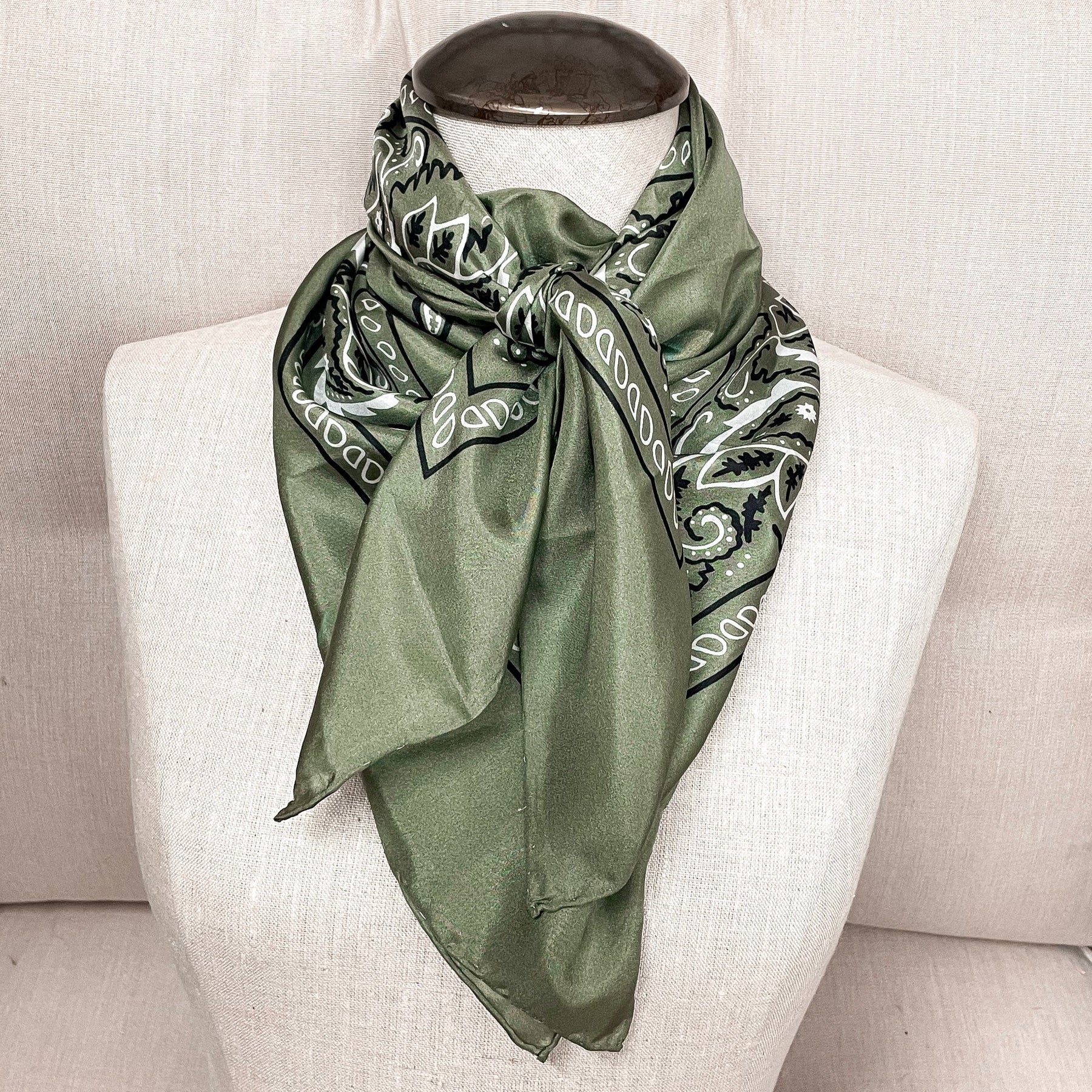 Brunette model wearing a short sleeve, black top with a sage green bandana scarf tied around her neck. This model is pictured in front of a beige background.